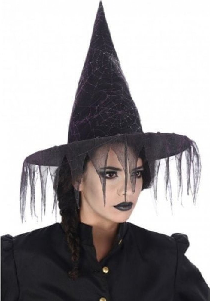 Černý tyl, který představuje pavučinky na klobouku částečně zakrývá obličej a dodá vašemu outfitu ten správný tajemný vzhled čarodějnice.