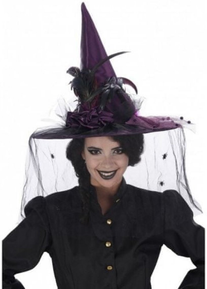 Krásný a originální polyesterový čarodějnický klobouk Delux s fialovým s černým peřím a závojem, pokrytým pavouky.