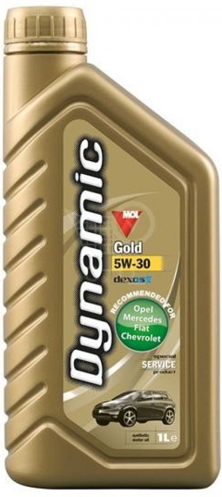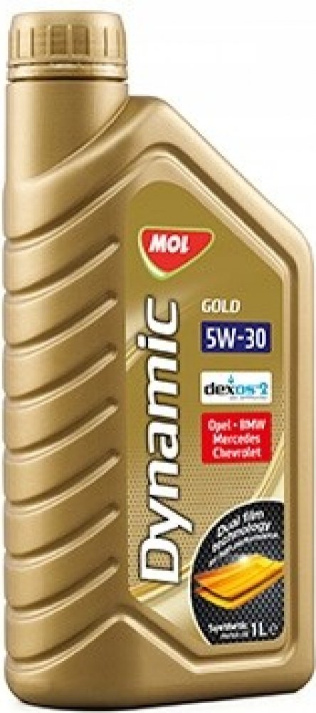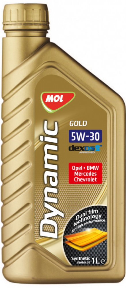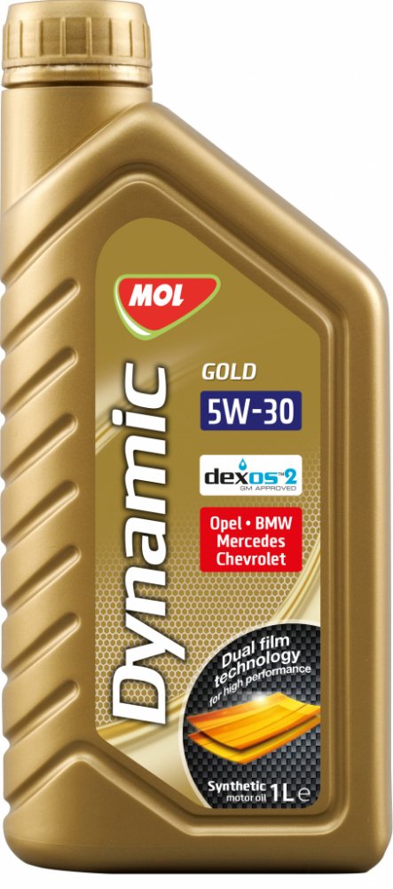 MOL DYNAMIC GOLD 5W-30 prémiový syntetický motorový olej s úsporou energie pro nejmodernější přeplňované a nepřeplňované osobní vozidla a transportéry. Splňuje nejnovější specifikaci General Motors Dexos 2 pro evropská vozidla a pro standardní výměnný interval oleje pro motory Volkswagen Group PD TDI. Specifické vlastnosti oleje MOL Dynamic Gold 5W-30: Nízký obsah sulfátového popela, síry a fosforu (Low SAPS). Dlouhá životnost katalyzátorů a filtrů pevných částic. Extrémní nízkoteplotní vlastnosti. Zajišťuje snadné startování i v extrémním chladu a prodlužuje životnost autobaterie. Nízká těkavost. Snižuje spotřebu motorového oleje. Výjimečná tepelná a oxidační stabilita. Snižuje tvorbu kalu při nízkých teplotách a usazenin při vysokých teplotách. Extrémně dlouhá životnost oleje. Lze snížit četnost prostojů, provozní náklady a dopad na životní prostředí. Vynikající zpracování sazí. Chrání proti tvorbě usazenin a udržuje čistotu válců motoru. Výkonové třídy, specifikace MOL Dynamic Gold 5W-30: API SN MB-Approval 229.51 MB-Approval 229.52 ACEA C3 ACEA C2 API SM API SL/CF VW 502 00/505 01 VW 505 00 Dexos 2 BMW Longlife-04 Balení MOL Dynamic Gold 5W-30: 1L 4L 55L 199L Mazací plán MOL