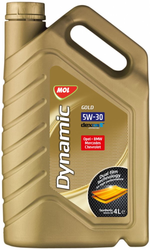 MOL DYNAMIC GOLD 5W-30 prémiový syntetický motorový olej s úsporou energie pro nejmodernější přeplňované a nepřeplňované osobní vozidla a transportéry. Splňuje nejnovější specifikaci General Motors Dexos 2 pro evropská vozidla a pro standardní výměnný interval oleje pro motory Volkswagen Group PD TDI. Specifické vlastnosti oleje MOL Dynamic Gold 5W-30: Nízký obsah sulfátového popela, síry a fosforu (Low SAPS). Dlouhá životnost katalyzátorů a filtrů pevných částic. Extrémní nízkoteplotní vlastnosti. Zajišťuje snadné startování i v extrémním chladu a prodlužuje životnost autobaterie. Nízká těkavost. Snižuje spotřebu motorového oleje. Výjimečná tepelná a oxidační stabilita. Snižuje tvorbu kalu při nízkých teplotách a usazenin při vysokých teplotách. Extrémně dlouhá životnost oleje. Lze snížit četnost prostojů, provozní náklady a dopad na životní prostředí. Vynikající zpracování sazí. Chrání proti tvorbě usazenin a udržuje čistotu válců motoru. Výkonové třídy, specifikace MOL Dynamic Gold 5W-30: API SN MB-Approval 229.51 MB-Approval 229.52 ACEA C3 ACEA C2 API SM API SL/CF VW 502 00/505 01 VW 505 00 Dexos 2 BMW Longlife-04 Balení MOL Dynamic Gold 5W-30: 1L 4L 55L 199L Mazací plán MOL
