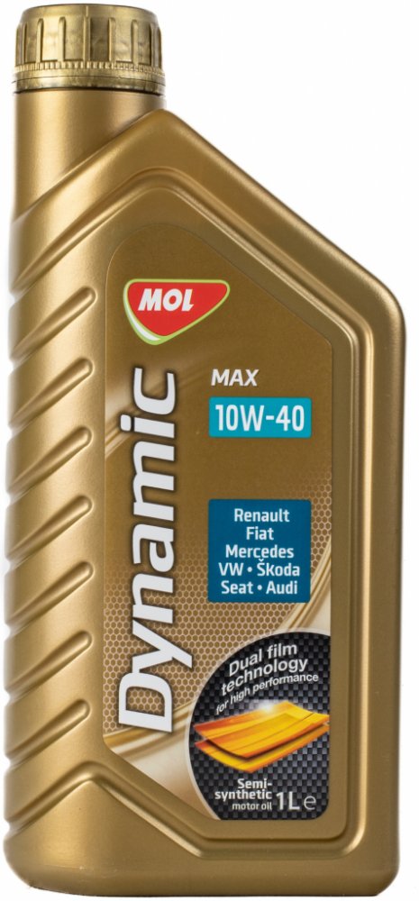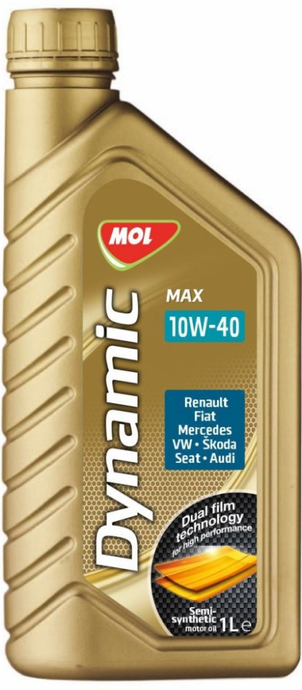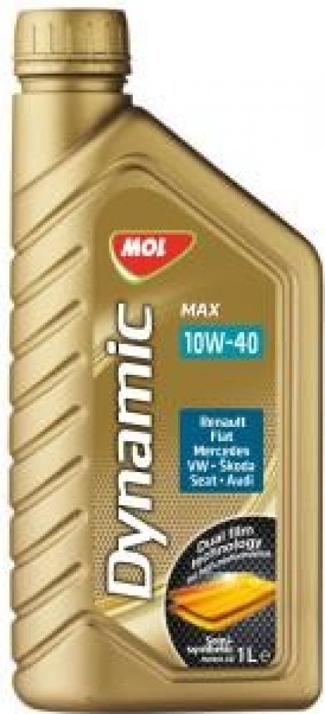 MOL Dynamic Max 10W-40 je částečně syntetický motorový olej na bázi syntetického základového oleje a vysoko rafinovaného ropného základového oleje a komplexního balíku přísad (detergenty, disperzanty, antioxidanty, protioděrové přísady, antikorodanty, protipěnivostní přísady, depresanty bodu tuhnutí a modifikátory viskozity). Olej splňuje vysoké parametry evropských specifikací pro benzínové a naftové motory osobních automobilů a americké specifikace pro benzinové motory. V důsledku nízkého vnitřního tření umožňuje snížit spotřebu paliva, zvláště při startu motoru. Zásluhou základových olejů, které se používají při výrobě, má olej nízkou odpařivost, která přispívá ke snížené spotřebě oleje a ke snížení tvorby emisí a tuhých látek. Díky vynikající oxidační stabilitě dochází jen k pomalé destrukci originálních vlastností oleje. ím je umožněná dlouhodobá ochrana motoru i za podmínek vysokých provozních teplot. Speciální komponety pomáhají zabraňovat tvorbě úsad a kalů v motoru.