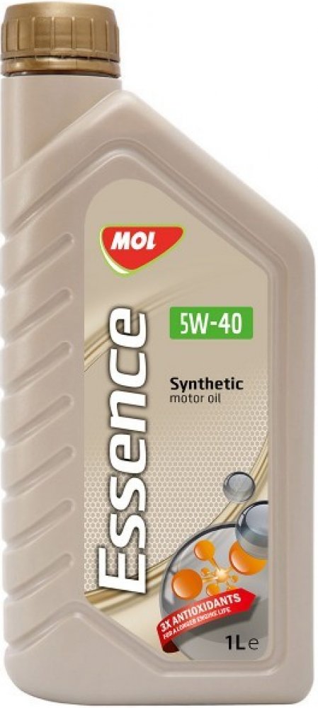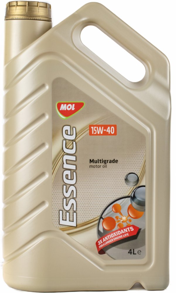 MOL Essence 15W-40 je moderní produkt vyroben z vysoce výkonných minerálních základových olejů, které poskytují trojitou antioxidační ochranu, použitím komplexního systému přísad, vyvinutý pro osobní automobily a užitková vozidla. Specifické vlastnosti oleje: Trojitá antioxidační ochrana. Zabraňuje vzniku volných radikálů způsobujících stárnutí oleje pomocí trojité antioxidační ochrany, čímž se zvyšuje životnost motorového oleje a motoru. Vynikající střihová stabilita. Zachovává si viskozitní vlastnosti během celého výměnného intervalu oleje. Nízká těkavost. Snižuje spotřebu motorového oleje a snižuje emise škodlivých látek. Výkonové třídy, specifikace: SAE 15W-40 API SJ/CF