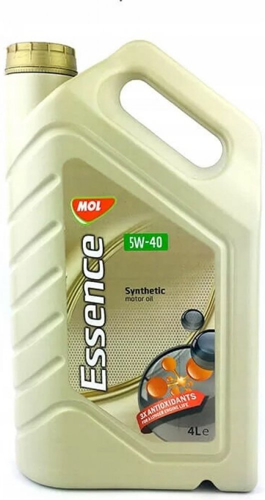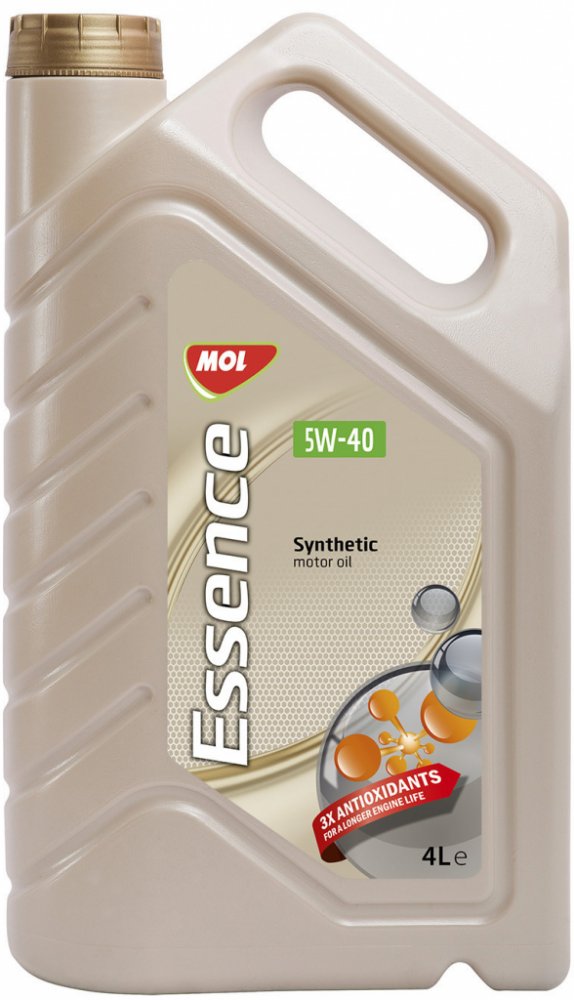 MOL Essence 5W-40 syntetický motorový olej zabezpečující trojitou antioxidační ochranu a prodlouženou životnost motoru pro moderní benzínové motory vozidel vybavených katalyzátory a naftovými motory s přímým vstřikováním. Specifické vlastnosti oleje: Trojitá antioxidační ochrana. Zabraňuje vzniku volných radikálů způsobujících stárnutí oleje pomocí trojité antioxidační ochrany, čímž se zvyšuje životnost motorového oleje a motoru. Extrémní nízkoteplotní vlastnosti. Zajišťuje snadné startování i v extrémním chladu a prodlužuje životnost autobaterie. Extrémně dlouhá životnost oleje. Lze snížit četnost prostojů, provozní náklady a dopad na životní prostředí. Nízká těkavost. Snižuje spotřebu motorového oleje. Výkonové třídy, specifikace: SAE 5W-40 API SN API SM/CF ACEA A3/B4-08 VW 502 00/505 00 Renault RN0700/RN0710