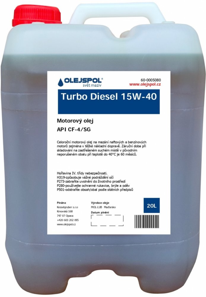 MOL TURBO DIESEL 15W-40 JE Originální olej výrobce MOL stáčený z IBC kontejneru do nového plechového sudu. Vysoce výkonný, vícestupňový motorový olej pro nepřeplňované a přeplňované naftové motory vystaveny vysokému zatížení a pracující v extrémních pracovních podmínkách. Zajišťuje vysokou ochranu motoru vůči opotřebení, čistotu a dlouhou životnost motoru. Vynikající zpracování sazí Chrání proti tvorbě usazenin a udržuje čistotu válců motoru. Vynikající střihová stabilita Zachovává si dlouhodobě příznivé vlastnosti i při vysokém smykovém zatížení a velkých zatíženích. Zachovává si viskozitní vlastnosti během celého výměnného intervalu oleje. Dobrá oxidační stabilita Snižuje se tvorba úsad při vysokých teplotách. Čistší motor. Vysoká alkalická rezerva Nepřetržitá neutralizace kyselin zajišťuje lepší ochranu proti korozi. Výkonové třídy, specifikace MOL TURBO DIESEL 15W-40: ACEA E2-96 Issue 5 API CF-4/CF/SJ MAN 271 Volvo VDS TEDOM 258-2 MTU Type 1 Avia Allison C-4 ZETOR Deutz DQC I-02 Detroit Diesel DFS 93K222 Balení MOL TURBO DIESEL 15W-40: 20L 60L (3x 20L) 200L 1000L Mazací plán MOL
