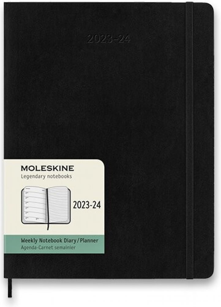 Extra velký černý plánovací zápisník na rok 2023-24. Diář je datovaný od července 2023 do konce roku 2024. Na levé straně jsou dny v týdnu a na pravé linkovaná stránka na poznámky. Diář má pevnou vazbu v kartonových deskách. Obepíná ho pružná páska proti samovolnému otevírání. Obsahuje praktickou vnitřní kapsu, textilní záložku a barevné samolepky. Papír s gramáží 70 g/m2 neobsahuje kyseliny.