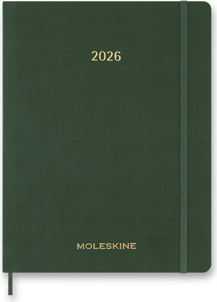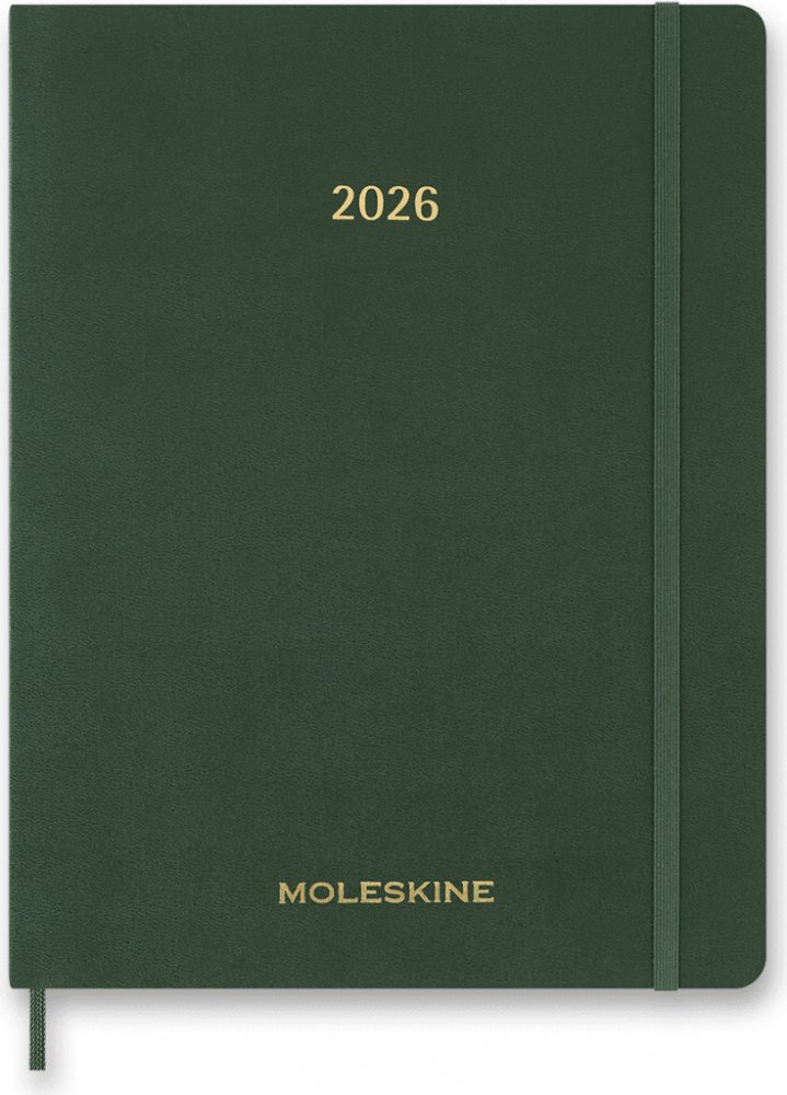 15měsíční diář Moleskine Essential, kalendář od října 2025 do konce prosince 2026. Týden je zde zobrazen vertikálně na dvou stránkách s hodinovými úseky od 7 do 20 hodin ve všední dny a víkendy bez časového omezení.