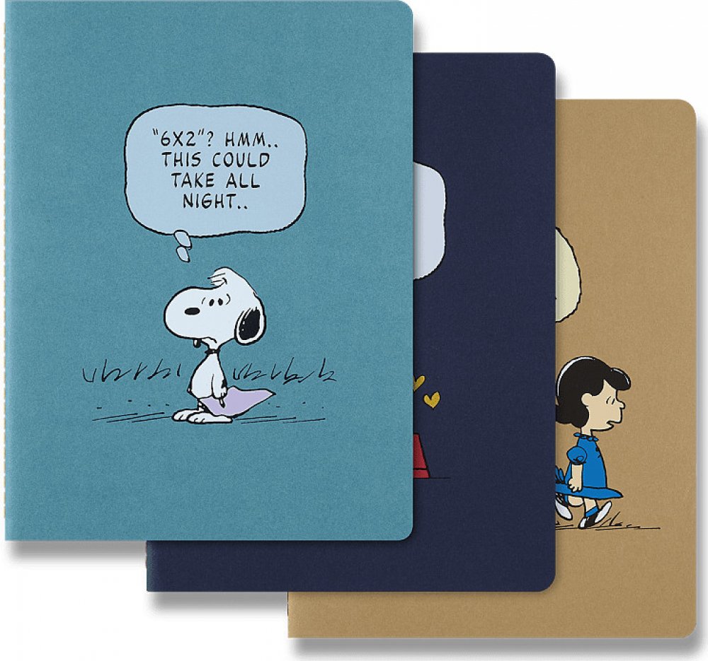 Sada tří sešitů Moleskine Cahier Peanut pro každou příležitost. Motiv každého sešitu s ikonickými ilustracemi Snoopyho a dalších postav z oblíbeného komiksu.