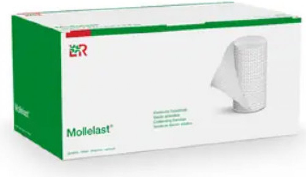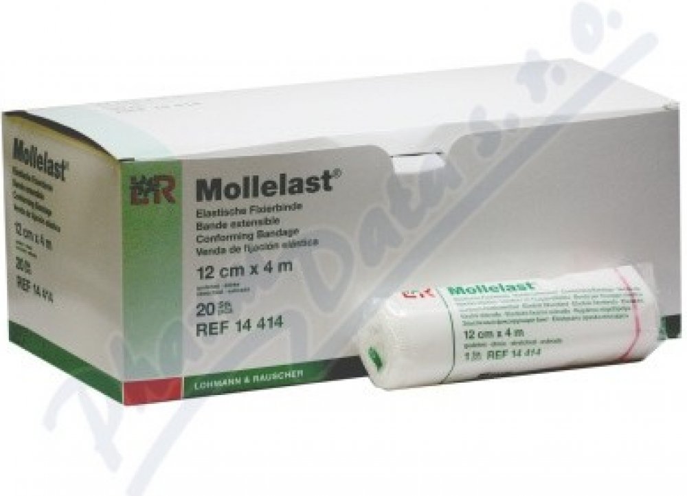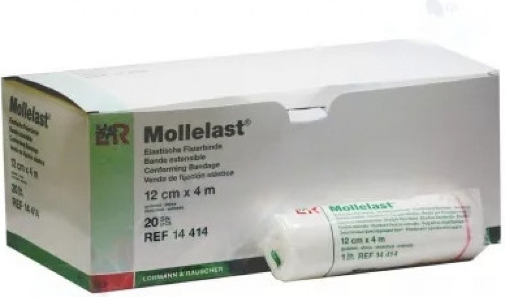 Mollelast je univerzální elastické obinadlo, které se používá ke znehybnění částí těla včetně kloubů, k fixaci obvazů nebo krytí na rány. Je vhodný také pro mírnou kompresi, zejména prstů na rukou a na nohou. Rozměr: 12cm × 4m. Obinadlo je baleno v celofánu. Zdravotnický prostředek.