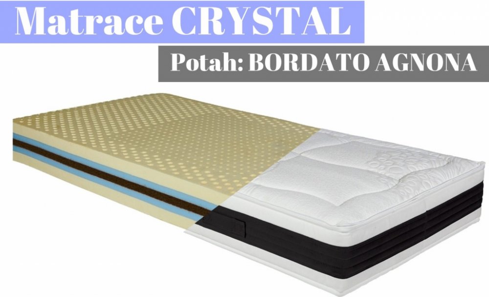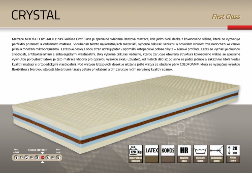 Prémiová matrace MOLMAT CRYSTAL z naší kolekce First Class je unikátně skládaná latexová matrace, kde jádro tvoří deska z přírodního kokosového vlákna, které se vyznačuje perfektní pružností a vzdušností matrace. Díky spojení těchto nejkvalitnějších materiálů s výbornou cirkulací vzduchu a odvodem vlhkosti zde nedochází ke vzniku plísní a množení mikroorganismů. Latexové desky z obou stran udržují páteř v optimální anatomické poloze díky 3–zónové profilaci. Latex se vyznačuje dlouhou životností, antibakteriálními a antialergickými vlastnostmi. Díky výborné cirkulaci vzduchu, kterou zaručuje otevřená struktura kokosového vlákna se speciálně vyvinutou pórovitostí latexu je tato matrace vhodná pro opravdu širokou škálu uživatelů, od malých dětí až po silně se potící jedince a zákazníky, kteří hledají kvalitní matraci s ortopedickými vlastnostmi. Pod vrstvou latexových desek je uložena ještě vrstva ze studené pěny COLDFOAM®, která se vyznačuje vysokou flexibilitou a tvarovou stálostí. Tato vrstva ze studené pěny tlumí nárazy páteře při otáčení, a tím zaručuje ničím nerušený kvalitní spánek.