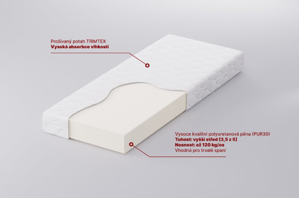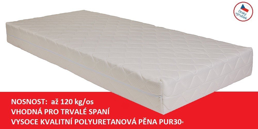 Vysoce komfortní jednodílná molitanová matrace určená pro širokou veřejnost. Matrace je vhodná pro trvalé spaní. Jádro matrace je tvořeno výhradně z plného bloku kvalitní polyuretanové pěny bez výřezů.