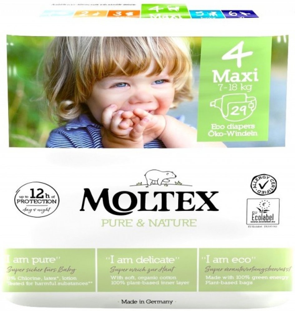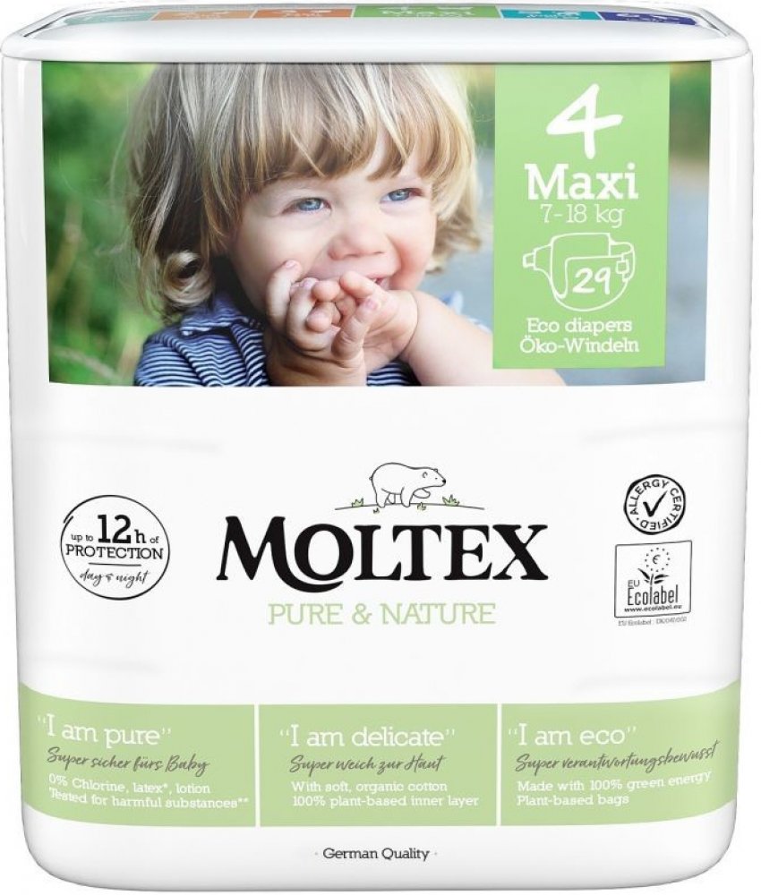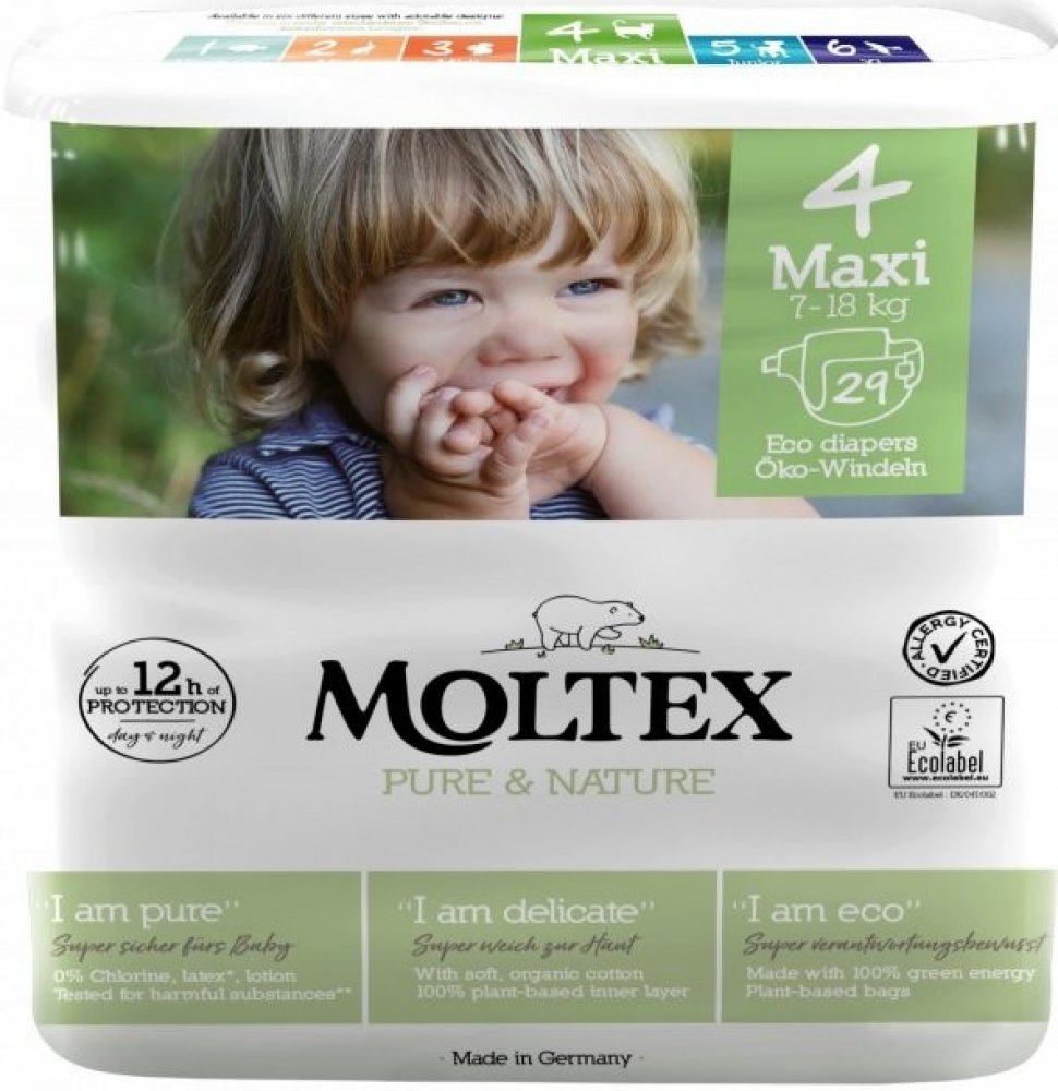 Díky přírodním materiálům jsou ekoplenky Moltex naprosto bezpečné a hypoalergenní. Zároveň však neztrácí svoji funkčnost, která je srovnatelná s běžnými konvenčními plenkami. Plenky udrží vlhkost až 12 hodin - Vaše děťátko tak bude v bezpečí a v suchu po celou noc.