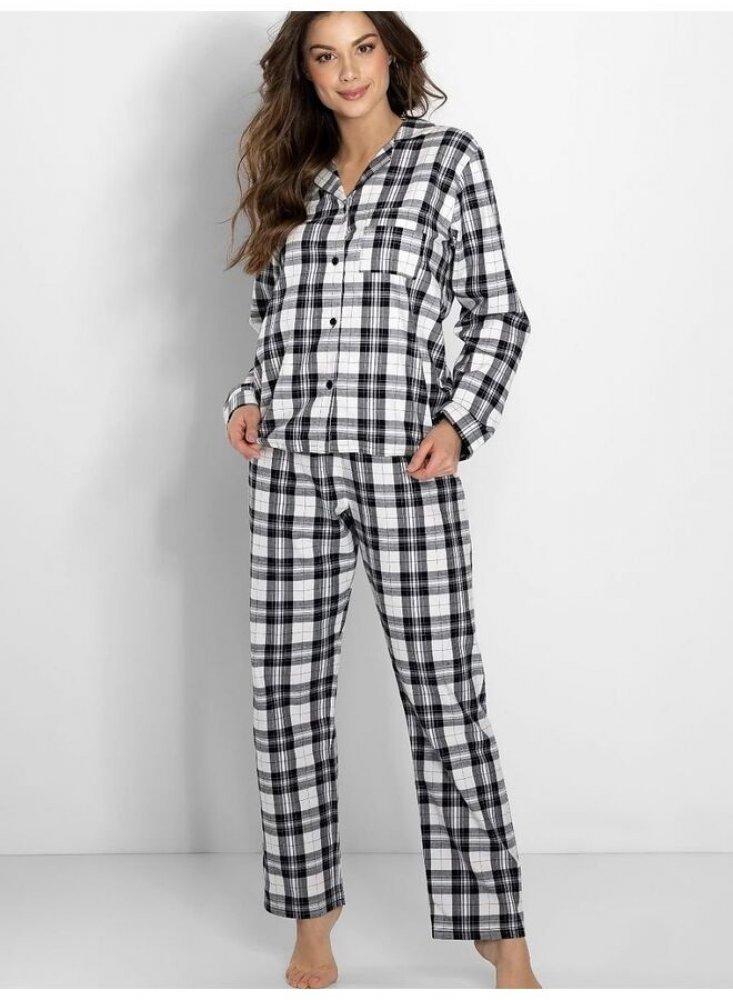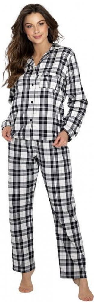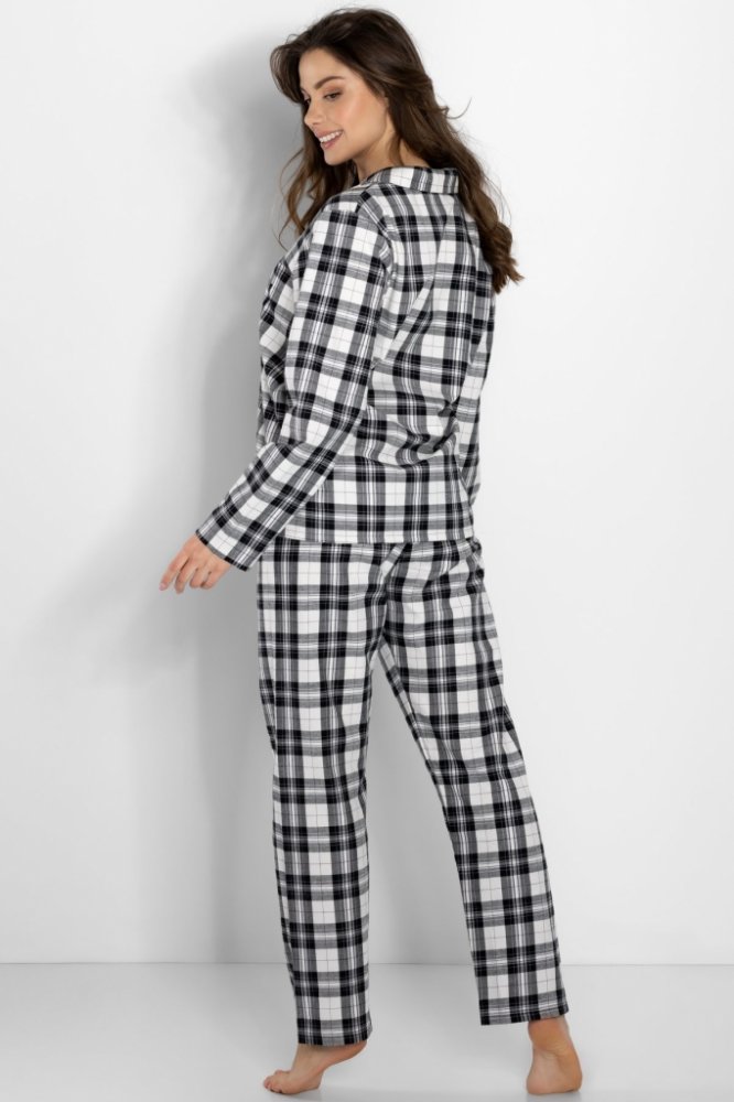 Pyžama model 198504 Momenti Per Me S černý Dámská pyžama navržená a ušitá v Polsku představují eleganci a pohodlí v jednom. Souprava se skládá z trička s dlouhým rukávem a dlouhých kalhot. Košile má výstřih do V, límeček, rukávy zakončené manžetami, volný oversize střih a zapíná se na knoflíčky. Kalhoty mají rovněž volný, pohodlný střih a elastický pas. Pyžamo je vyrobeno z přírodních materiálů a umožňuje pokožce dýchat. Kvalitní zpracování zajišťuje dlouhou životnost. Vyhněte se sušení v sušičce. Díky jemnému a elegantnímu designu je pyžamo ideální také jako dárek. Oblečení » Pyžama, noční košile a župany » Pyžama » Pyžama model 198504 Momenti Per Me S černý