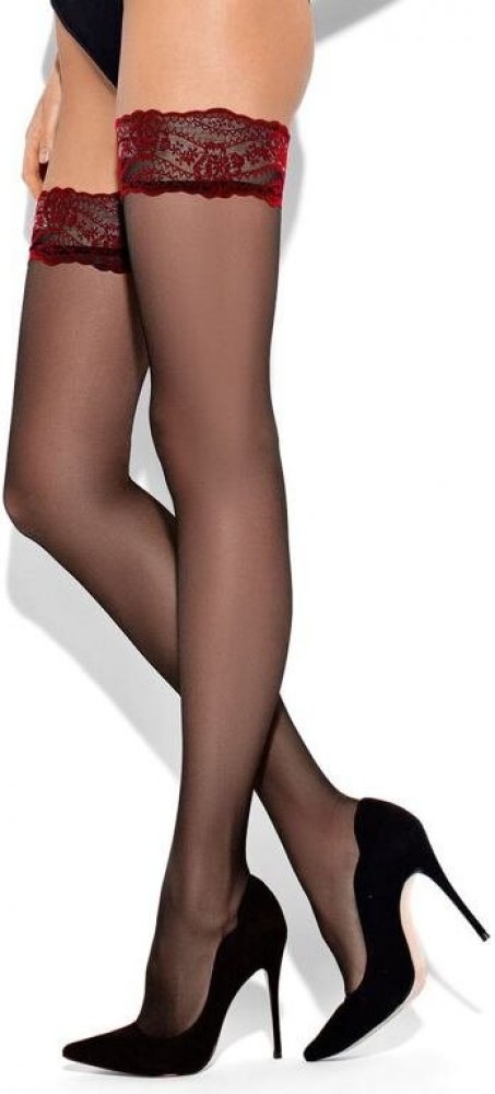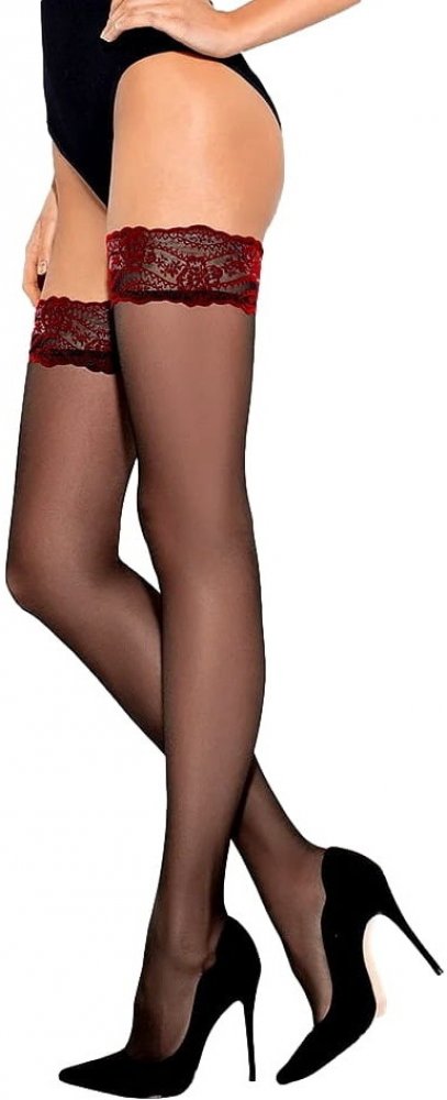 Neobyčejně žensky působící exkluzivní dámské punčochy s jemností 20 DEN. Punčochy jsou ozdobené krajkou v červené barvě (šířka 8 cm). Špičky nejsou vyznačené. Punčochy jsou při nošení pohodlné a elegantní.
