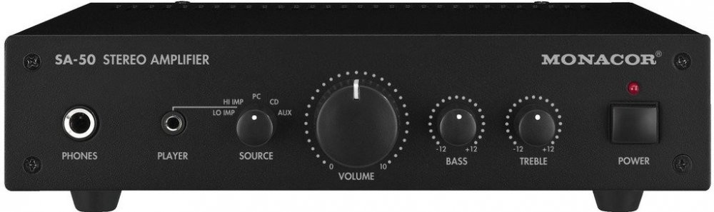 Kompaktní univerzální stereo zesilovač, 25 W. Tichý provoz díky chladicímu systému dodatečný konektor jack 3,5 mm s přepínatelnou citlivostí na předním panelu přepínač audio zdrojů pro regulaci hla