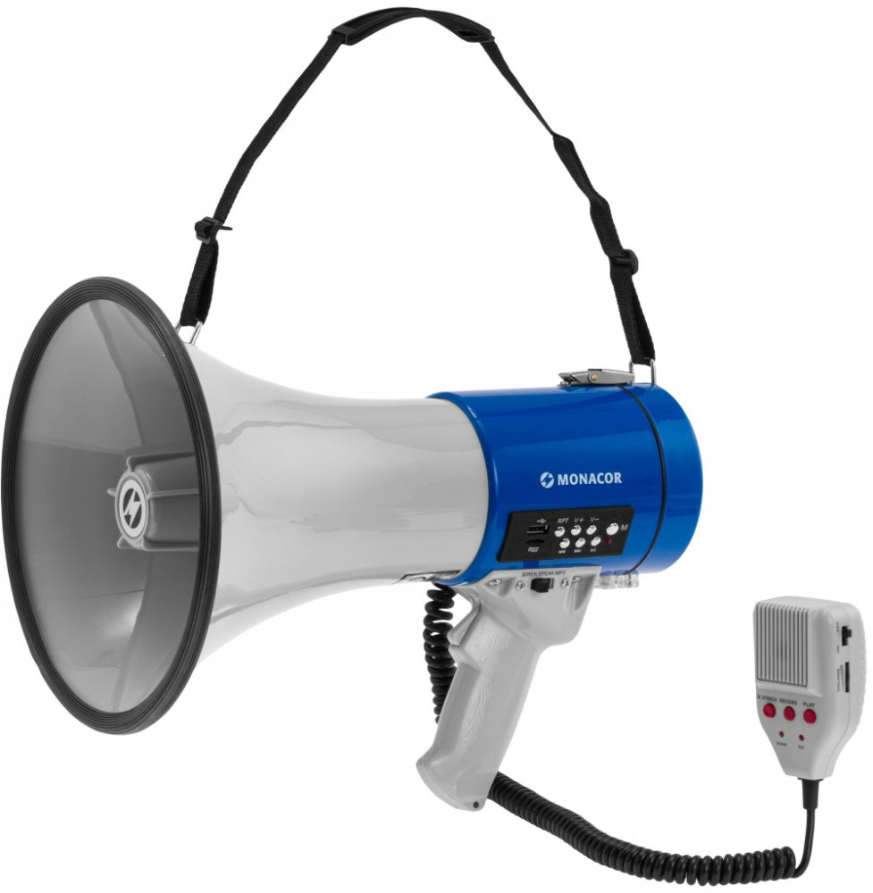 Megafon s možností přehrávání MP3 / USB, micro SD /, odnímatelným mikrofonem a sirénou. Výkon: 25W, 110 dB, napájení: 8 x 1,5V baterie velikost C (není součástí dodávky). Rozměry: 230mm x 340mm, váha: 1,7kg