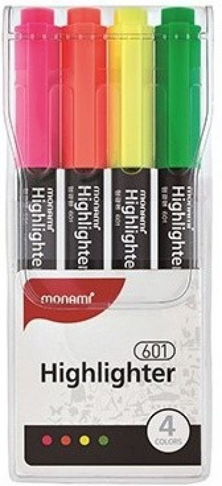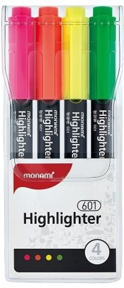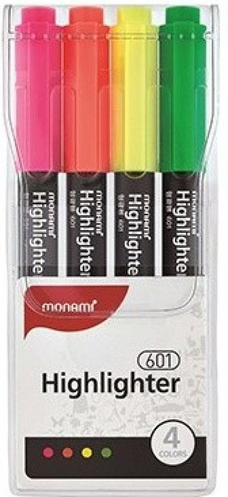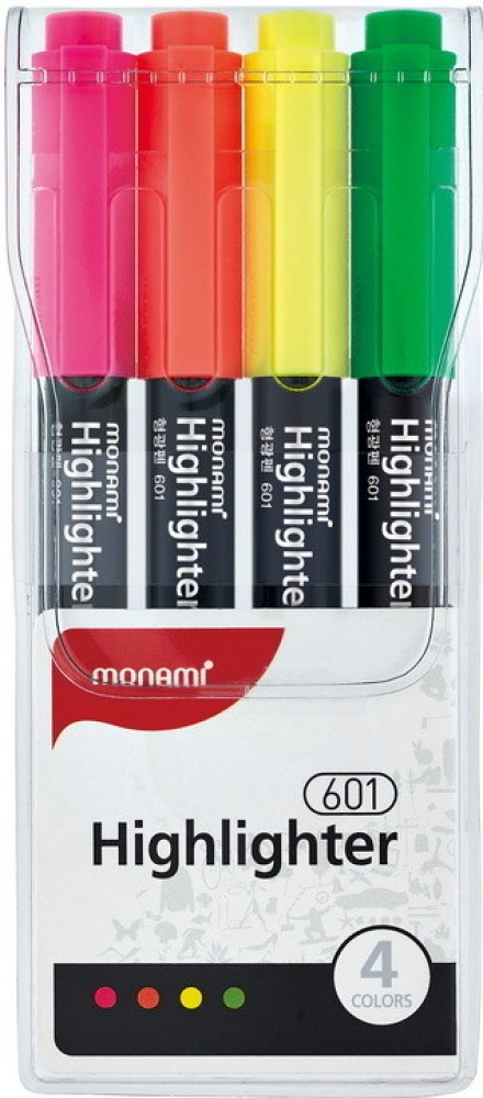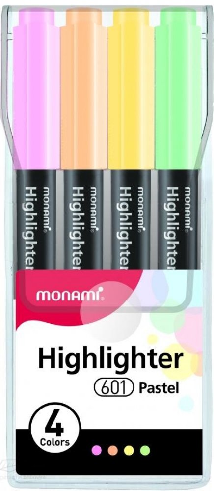 Monami 601 jsou zvýrazňovače, které se skvěle drží, plast je příjemný na dotek. Stopa je stálobarevná od začátku do konce, nedochází k blednutí inkoustu na papíře. Ideální na značení, zvýrazňování, malování, vybarvování. Pastelové odstíny žluté, růžové, oranžové, zelené. Brvy jsou stálé, odolné proti blednutí. Rovnoměrná sytá stopa inkoustu. Použití na papír. Kulaté černé tělo velice příjemné na dotek. Víčko v barvě náplně s klipem k uchycení, zabraňuje skutálení. Baleno v plastovém pouzdře. Seříznutý hrot, šířka stopy 1-4 mm.