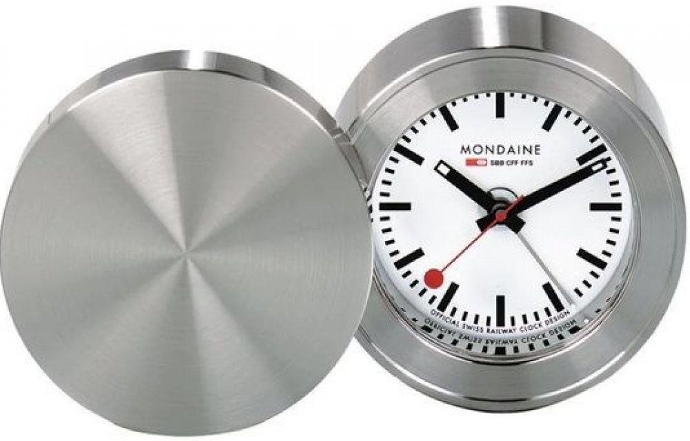 MONDAINE MSM.64410 je cestovní budík jehož kovové pouzdro má průměr 50 milimetrů a tloušťku 26 milimetrů. Přehledný číselník v bílé barvě je chráněn tvrzeným minerálním sklem a je inspirován ikonickými nádražními hodinami s červenou sekundovou ručkou. Konce hodinové a minutové ručky disponují luminiscenčním nátěrem, který usnadňuje čitelnost ve tmě. Chod hodin zajišťuje quartzový strojek.