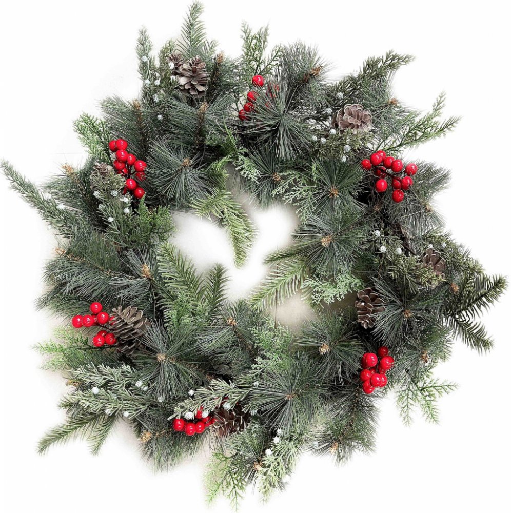 Dekoraci doplňují drobné zasněžené prvky, hnědé šišky a výrazné červené bobule, které dodávají věnci živý kontrast. Některé šišky mají jemný bílý nádech, připomínající čerstvý sníh.