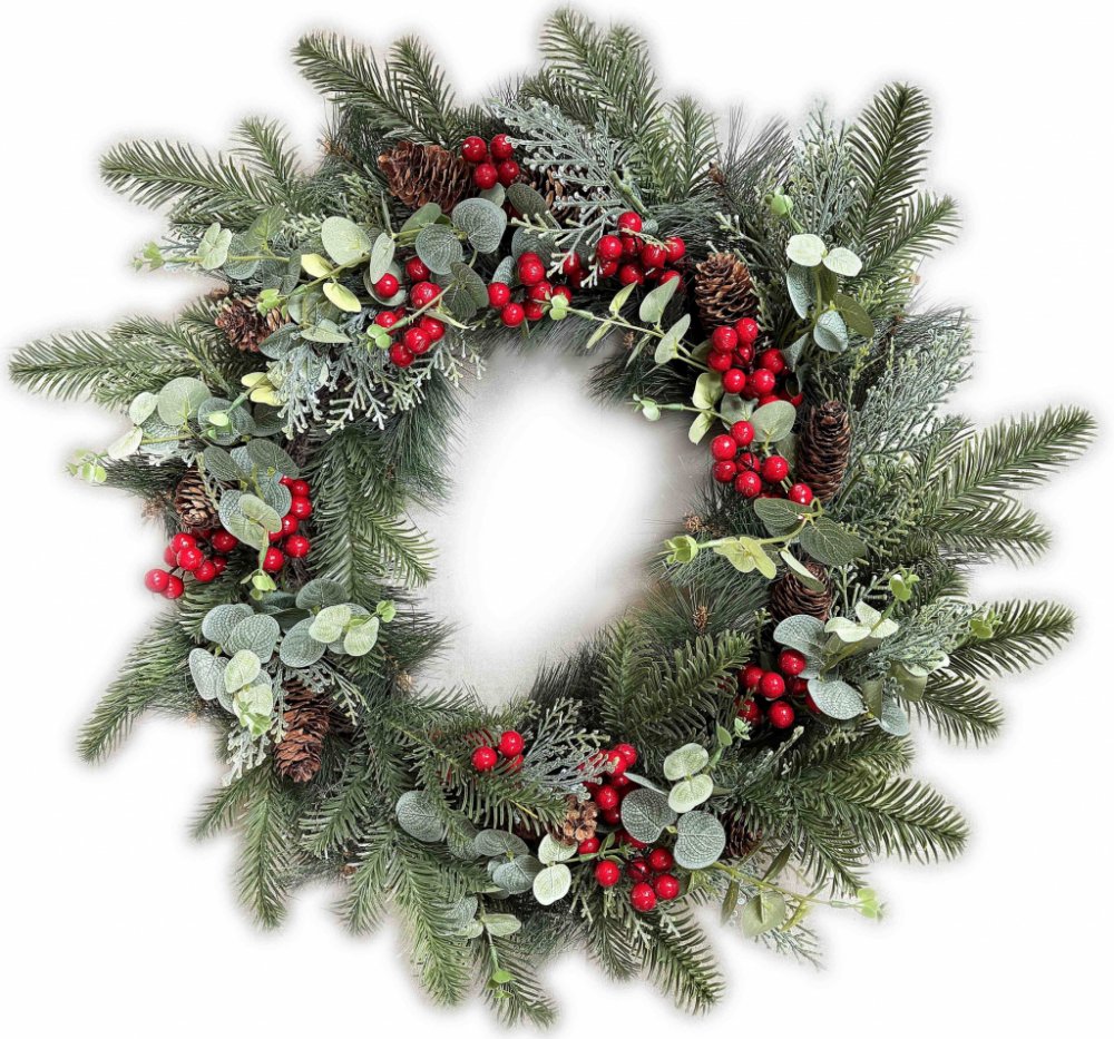 Tento věnec kombinuje svěží jehličnany s červenými bobulkami, šiškami a jemnými eukalyptovými listy, což vytváří harmonický a tradiční zimní design. Průměr věnce je 50 cm, díky čemuž je ideální pro zavěšení na vstupní dveře, stěny nebo pro umístění do interiéru, kde se stane ústředním prvkem výzdoby.