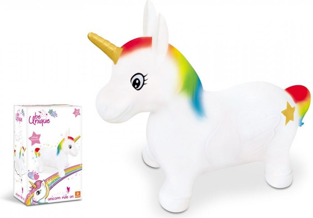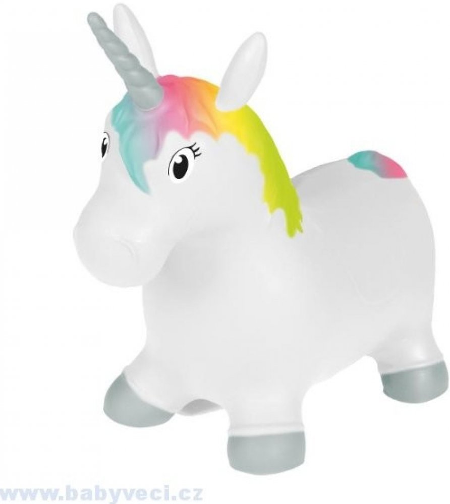 Veselé hopsadlo pro děti - bílý gumový jednorožec s duhovou hřívou a ocáskem - zabaví každého malého rošťáka.