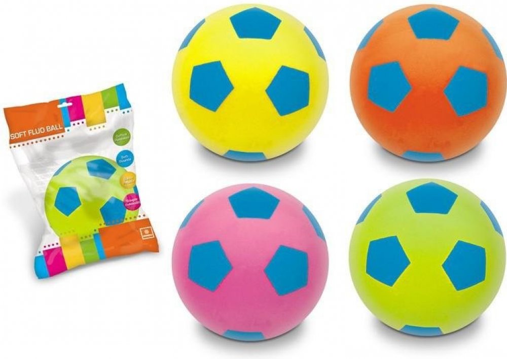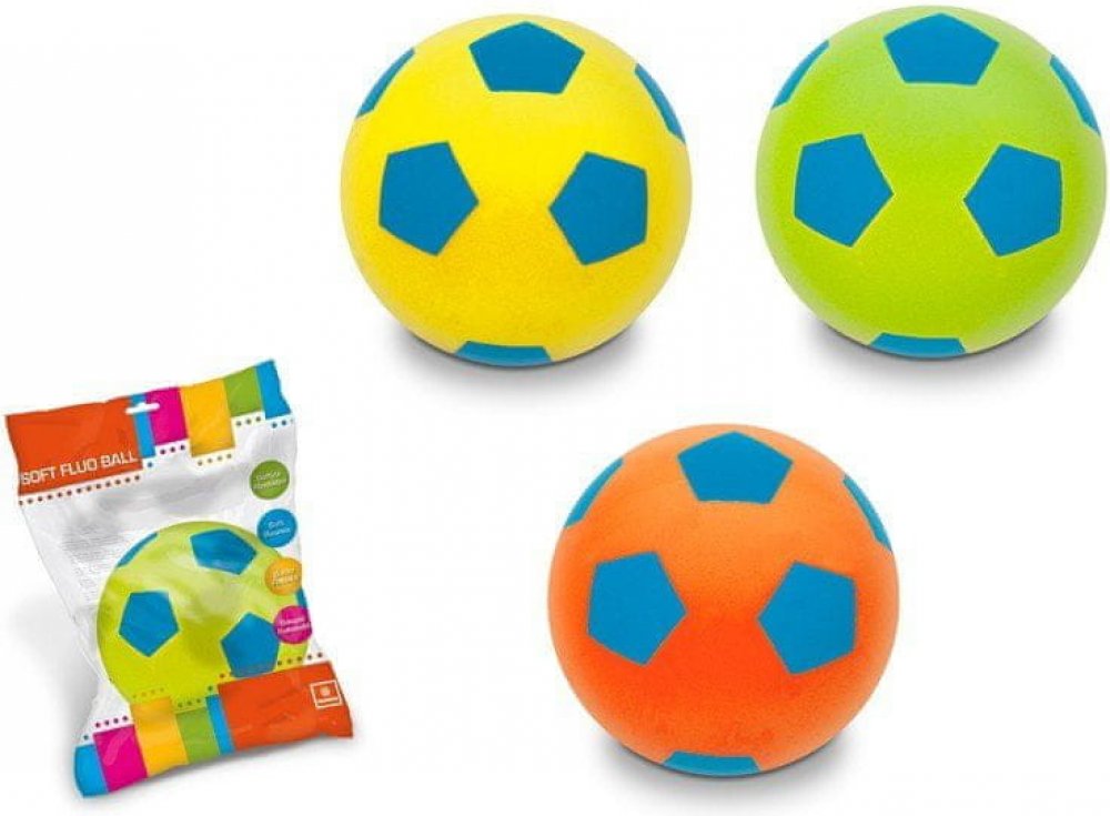 Měkký pěnový "fotbalový" míč z pěny, ve čtyřech jasných barevných variantách, s modrým potiskem, vhodný i pro použití v interiéru. Molitanový míč je vhodný také pro děti do školních tělocvičen, nebo jiných