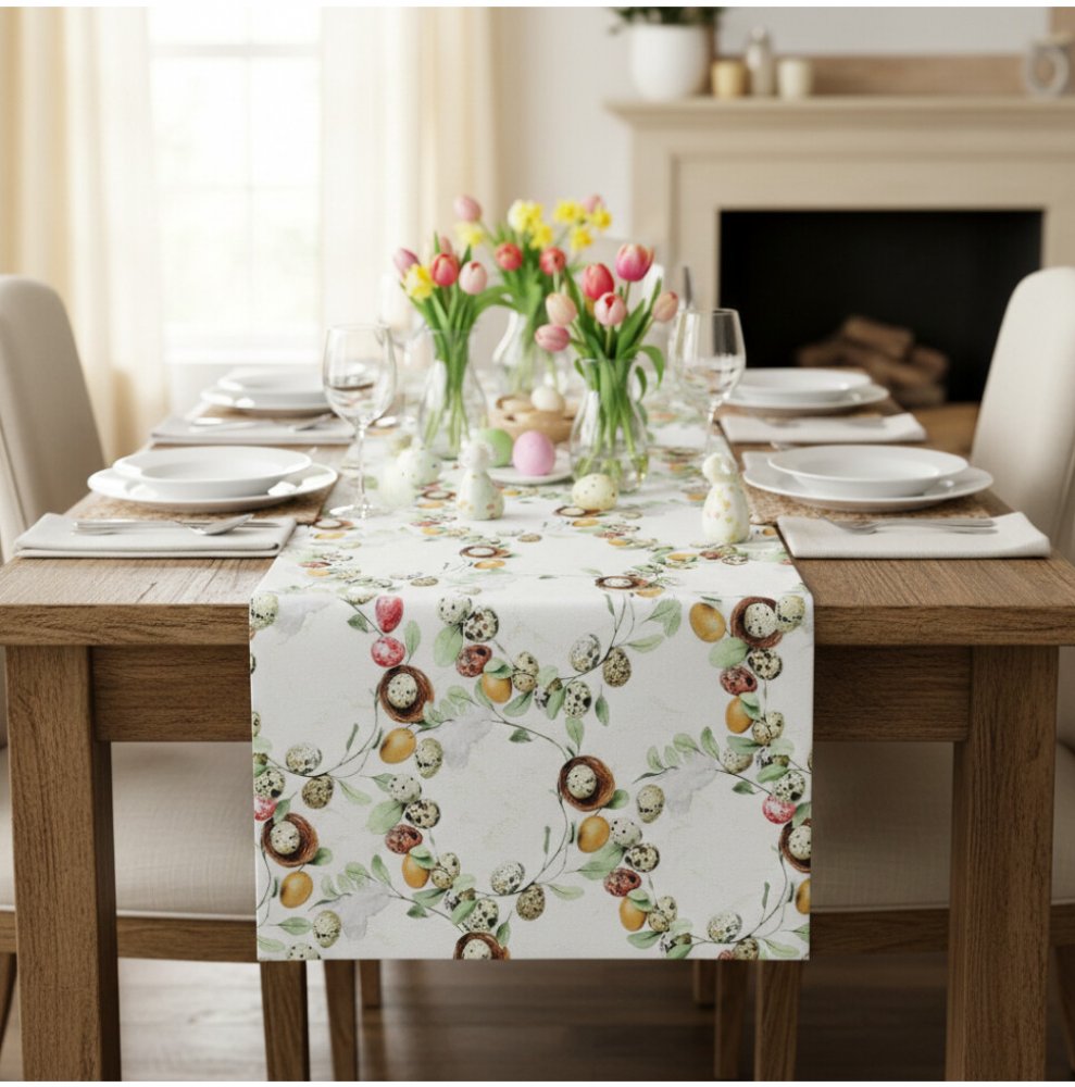 Vytvořte dokonalou velikonoční atmosféru s tímto nádherným žakárovým behúňom na sstůl! Jeho elegantní vzor s jemnými jarními motivy – hnízda, překrásná tečkovaná vajíčka, zelené lístky a jemné pastelové tóny – dodá vašemu stolu jedinečný šarm.