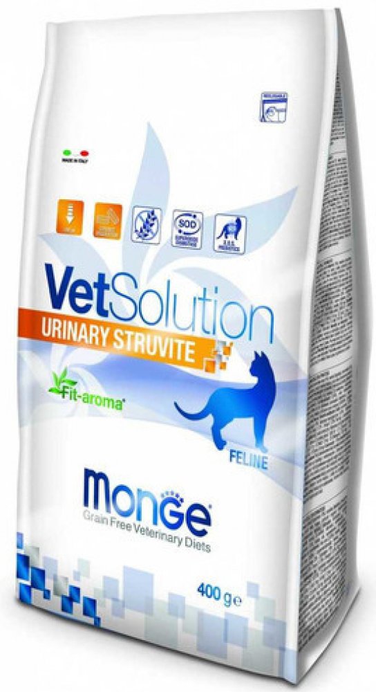 Fit-aroma® v MONGE VETSOLUTION FELINE URINARY STRUVITE obsahuje extrakt z brusinek bohatý na proanthocyanidiny (PACs). Proanthocyanidiny se se svými jedinečnými molekulárními strukturami vážou na adheziny (virulentní faktory podílející se na uchycení se bakterií na uroteliálních buňkách). Působí pomocí inhibice různých typů adhezinů (MR a MS adhezinů) on řasinkách, které vyčnívají z bakteriálního povrchu. Jedním z nich je fruktóza, která zabraňuje inhibici MS fimbriálních adhezinů; druhý je inhibitor s vysokou molární hmotností, který neutralizuje MR adheziny, čímž předchází osídlení močového měchýře bakteriemi. Oligomerní proanthocyanidy mohou zabránit peroxidačnímu zranění způsobenému struvity, obnovují intracelulární antioxidační aktivitu enzymů a zvýšují účinnosti SOD. Průměrná doba rozpouštění je 8 týdnů u struvitů vyvolaných infekcí a 2 až 4 týdny u sterilních struvitových urolitů.