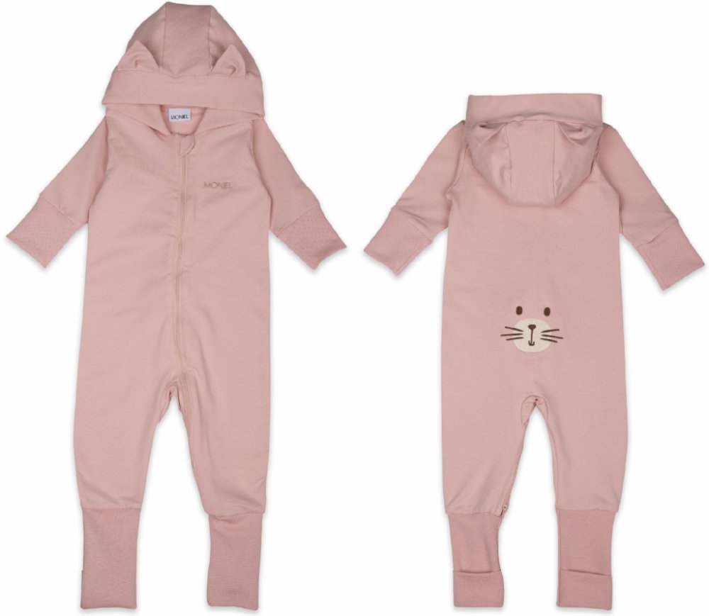 Pudrově růžový overal má kapuci s roztomilými kočičími oušky, která pomůže udržet hlavičku miminka v teple a zároveň doplňuje overálek o krásný designový prvek.
