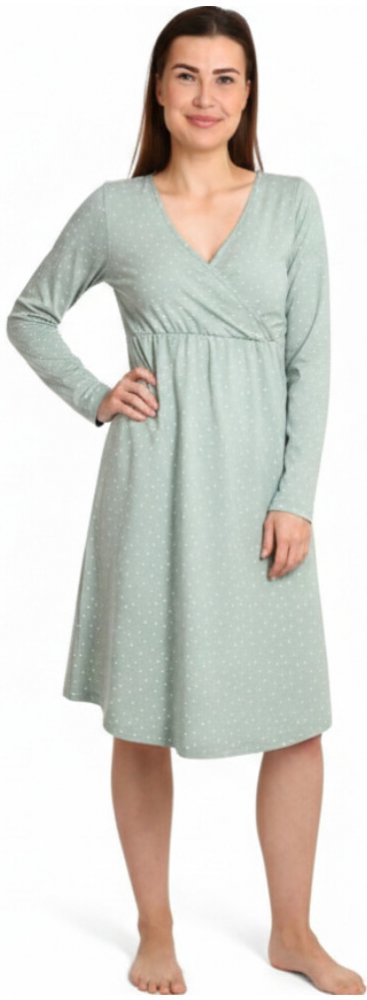 Dámská těhotenská a kojící košilka s dlouhým rukávem Moniel Dots mintová je noční košilka a pohodlné domácí šaty v jednom! Je to multifunkční kousek oblečení, který vám vydrží po celou dobu těhotenství, kojení a mateřství.