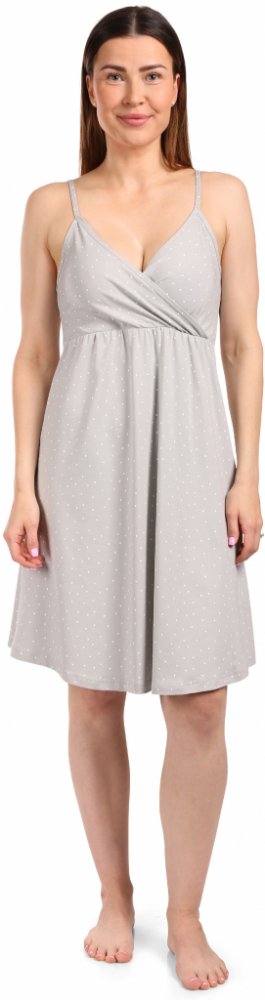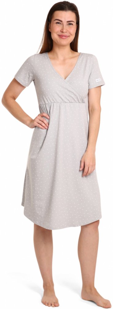 Dámská těhotenská a kojící košilka Moniel Dots šedá je noční košilka a pohodlné domácí šaty v jednom! Je to multifunkční kousek oblečení, který vám vydrží po celou dobu těhotenství, kojení a mateřství.