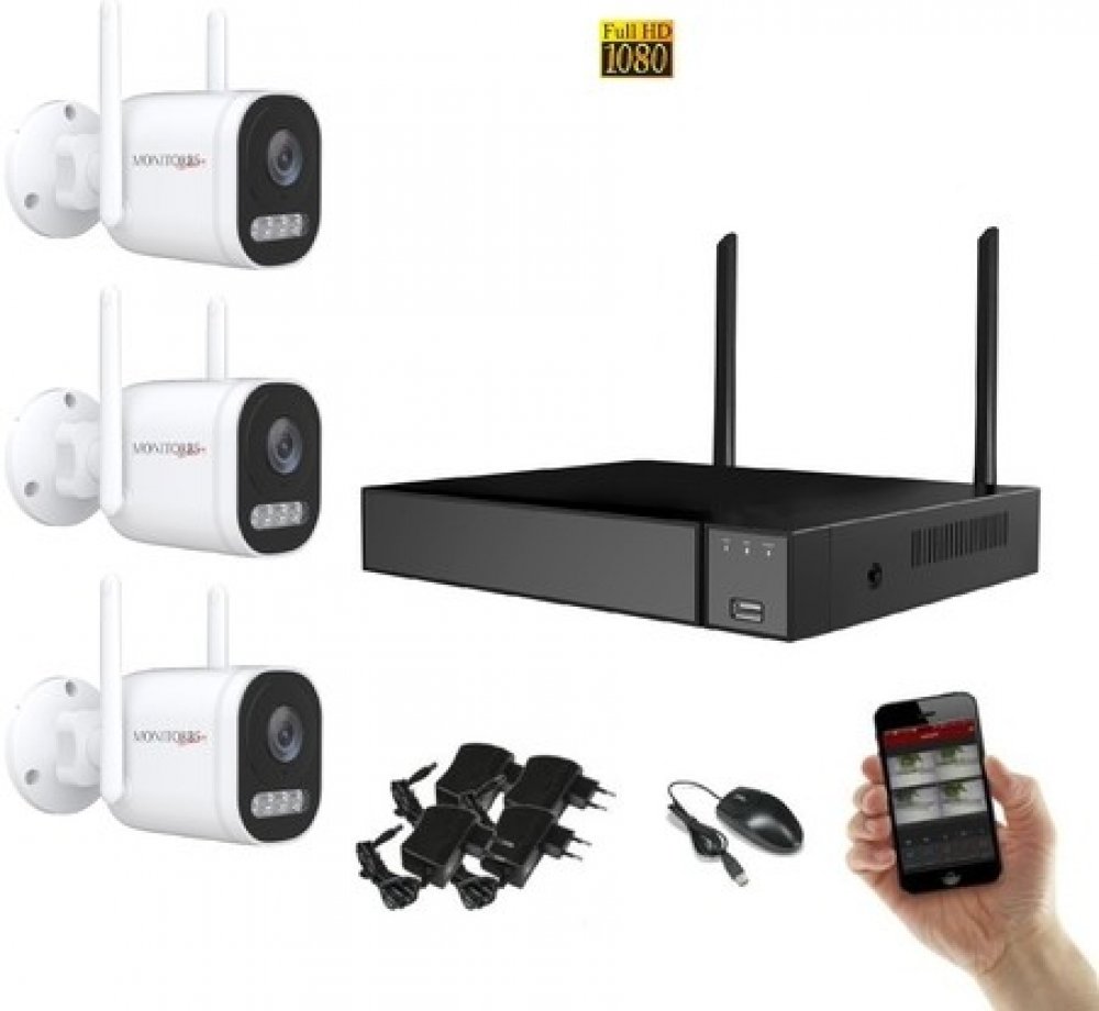 Bezdrátový kamerový systém WIFI se 3 kamerami s rozlišením 2 Mpix - 1 920 (H) * 1 080 (V)Bezpečnostní kamery jsou v plastovém, vodotěsném (IP65) pouzdře s nočním přísvitem až do 25mZáznamové zařízení je 8 kanálové, čili zůstává možnost na dodatečné rozšíření kamerového systému.České menuVideo výstup: 1x VGA + 1 x HDMIObousměrná audio komunikace pomocí vestavěného mikrofonu a reproduktoruRežim nahr...
