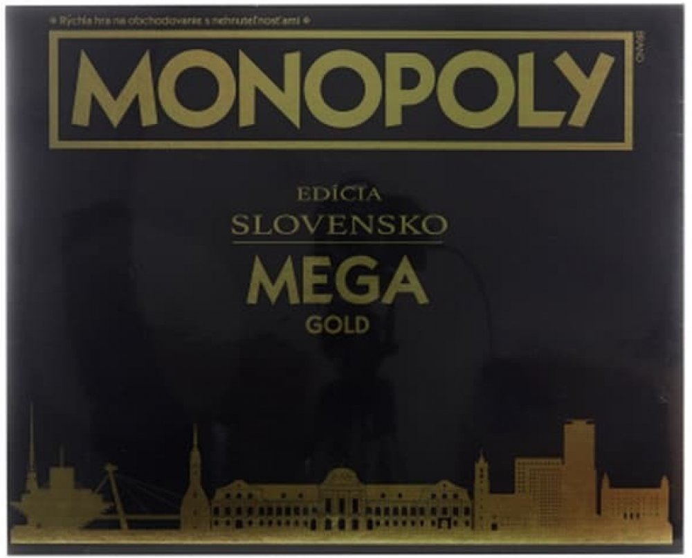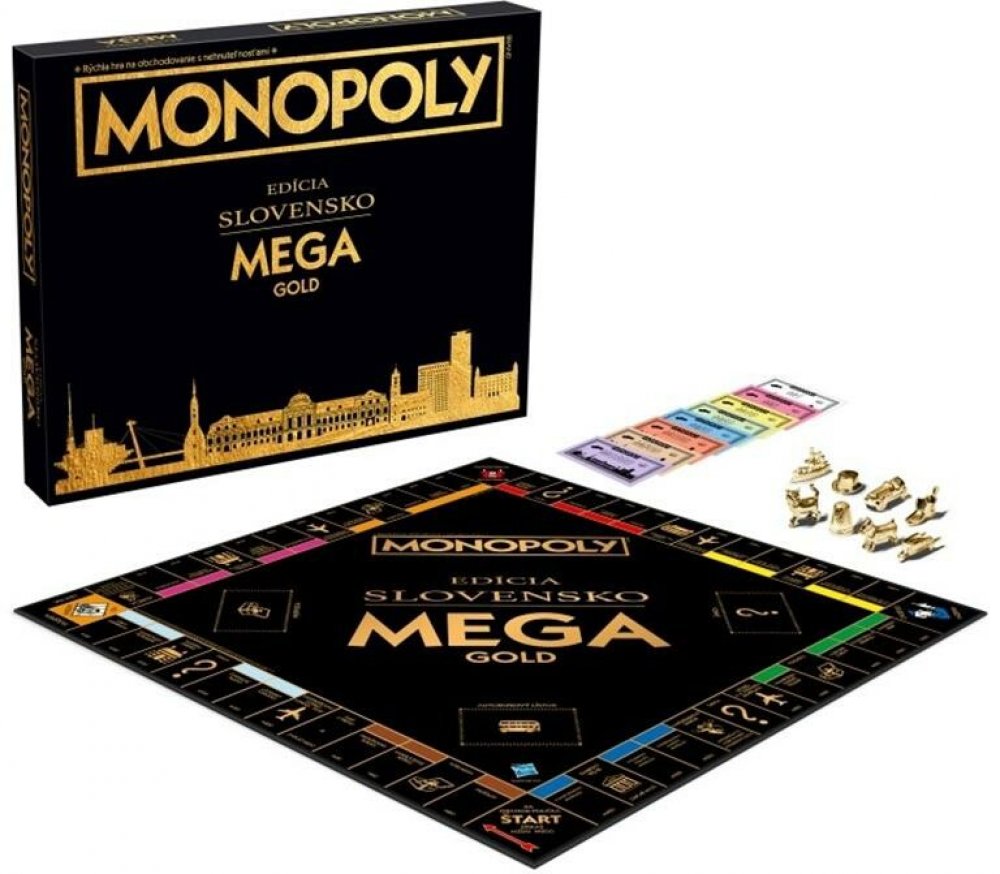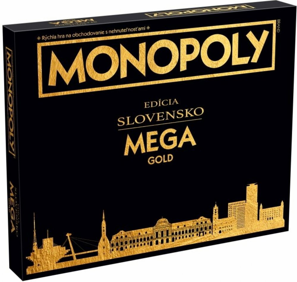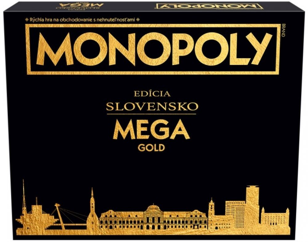 Monopoly Mega SlovenskoHra Monopoly Mega Slovensko je desková hra pro celou rodinu. Oproti klasické hře Monopoly můžete v mega edici Slovensko vlastnit víc nemovitostí, kupovat víc budov a manipulovat s větším množstvím peněz. Zahrát si může 2 až 6 hráčů od 8 let, kteří budou obchodovat, nakupovat, vymýšlet strategii a snažit se získat co nejvíce nemovitostí a majetku. Hra Monopoly Mega Slovensko má elegantní černý herní plán s barevně odlišenými poli a zlaté herní figurky. Hra děti učí počítat, plánovat, logicky uvažovat a komunikovat. Deskovka je ve slovenském jazyce. 8+ doporučený věk 2-6 hráčů počet hráčů 120 min délka jedné hry Klíčové vlastnosti deskové hry Monopoly Mega SlovenskoMonopoly Mega Slovensko jsou desková hra pro celou rodinuPravidla jsou obdobná jako v klasické hře Monopoly, ale v Mega Slovensko má hrací plán více políček a máte více možností získat majetek