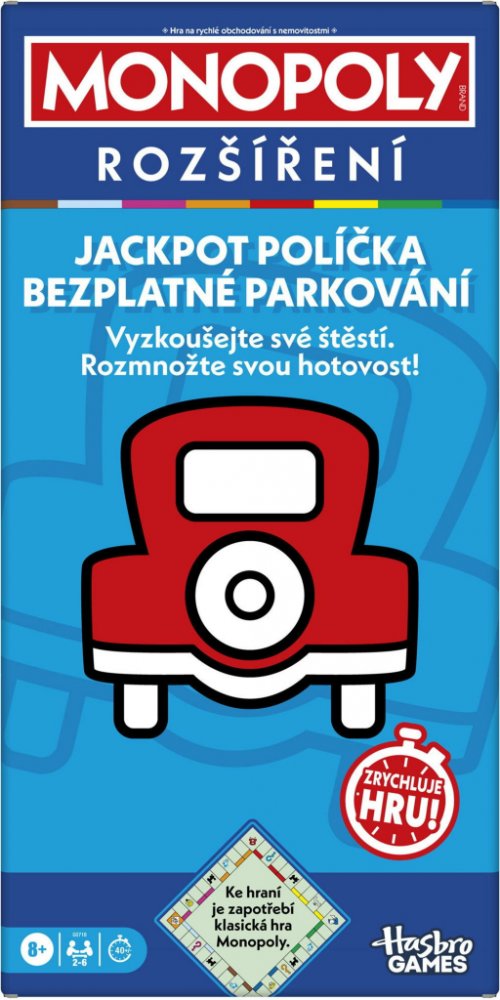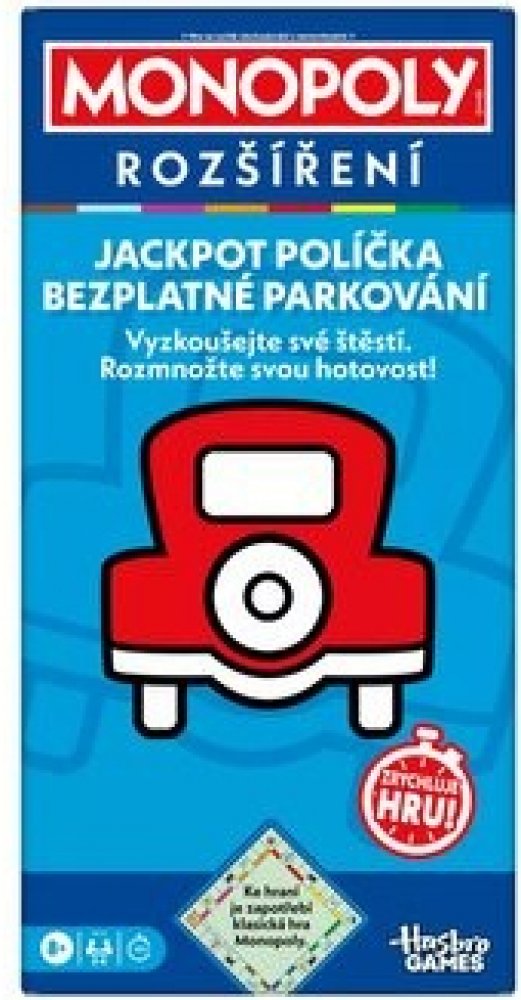 Zkuste své štěstí a získejte hromadu peněz! Rozšíření Jackpot políčka Bezplatné parkování pro hru Monopoly přináší do klasické hry zábavné zpestření a hru Monopoly s ním dohrajete dvakrát rychleji. Stačí toto rozšíření připojit ke klasické desce Monopoly a proměnit políčko Bezplatné parkování v Jackpot.