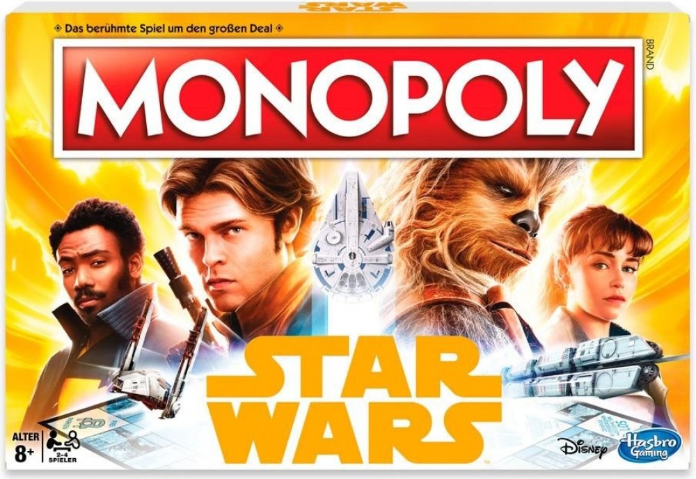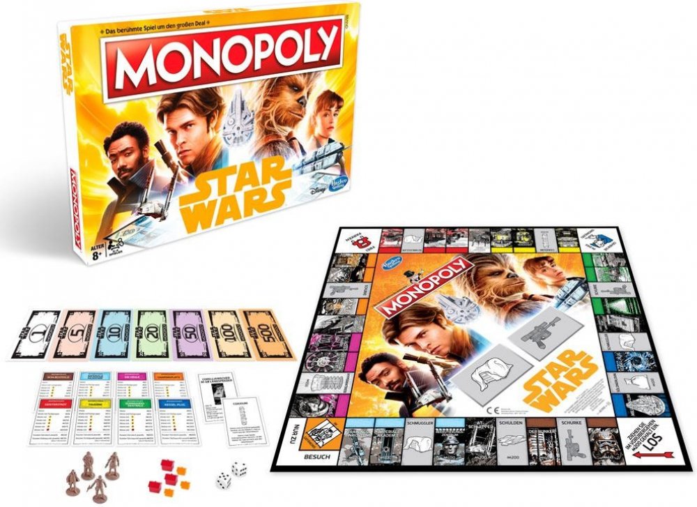 Enter a world of smugglers and adventure! Explore the galaxy with Han Solo and his group of fellow scoundrels in this Solo: A Star Wars Story Monopoly game. Journey from the Battlefield to the Spice Mines and beyond. Take control of the Millennium Falcon and make it through the Kessel Run. Players aim to buy as many Star Wars Locations, Vehicles, and Power Sources as possible and take risks with the Smuggler and Scoundrel cards. The last player with money left when all other players have gone bankrupt wins!\n\nIncludes gameboard, 4 plastic character tokens, 28 Title Deed cards, 16 Smuggler cards, 16 Scoundrel cards, 32 Hideouts, 12 Facilities, 2 dice, money pack, and game guide.