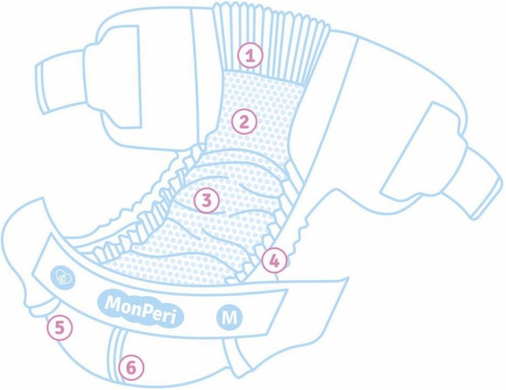 MonPeri jsou hypoalergenní, neparfemované a bělené bez použití chloru. Buničina uvnitř plenky s certifikací TCF (Totally Chlorine Free).