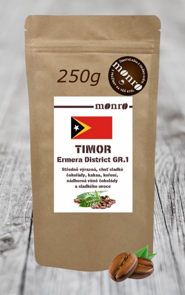 Unikátní timorská káva 100% Arabika Timor Emera District Gr.1 se sladkou chutí hořké čokolády, koření a kakaa, s nádhernou vůní čokolády, ovoce a citrusů. Zrnková káva je čerstvě pražená v pražírně Káva Monro. Balení 500g