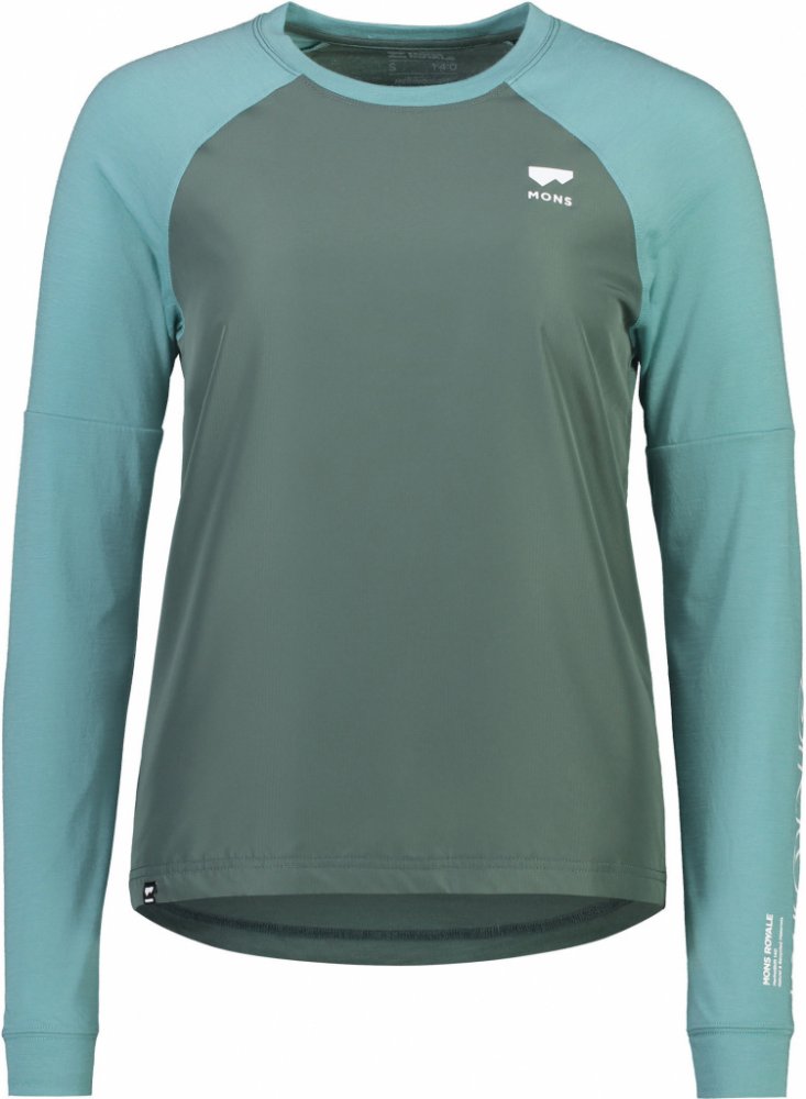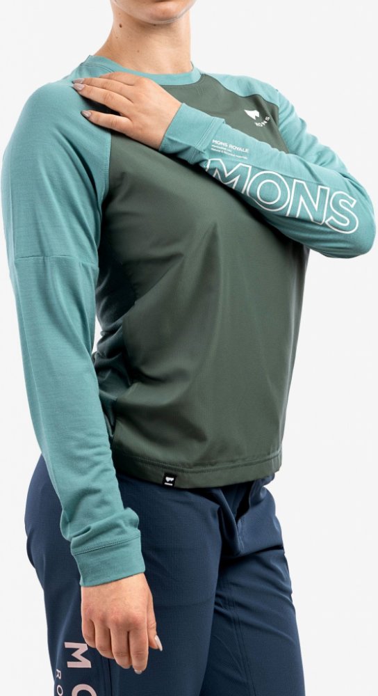 Dámský bike dres do chladnějšího počasí s dlouhým rukávem a zesíleným předním dílem z polyesteru a merina. Má také prodloužený zadní díl, tak jak to máme u cyklo dresů rádi. Volnější střih a raglánové rukávy, zajistí příjemný fit a volnost pohybu. Je vyrobený z úpletu Merino Shift - kombinace 52 % merino ovčí vlny, 35 % polyesteru a 13% nylonu pro větší mechanickou odolnost dresu a lepší transport vlhkosti než čisté merino.Dámský merino dres s dlouhým rukávem Mons Royale Tarn Shift Wind sage / burnt sage