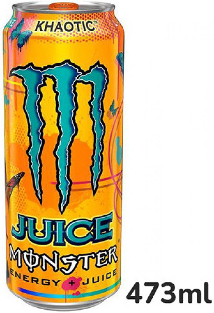 Energetický nápoj Monster, nízkokalorický s příchutí tropického ovoce Složení: voda, cukr, glukóza, jablečný džus z koncentrátu, přírodní aroma, taurin, kyselina citronová, ovocný džus z koncentrátu (broskev, nektarinka), regulátor kyselosti (citronan sodný), ananasový džus z koncentrátu, extrakt z kořene ženšenu, koncentrát ze šťávy z bílého hroznu, konzervační látka (sorban draselný), kofein, k...