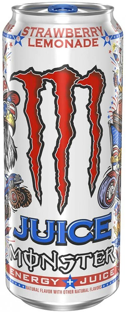 Jeden ze dvou patriotických plechů Monsteru, který vznikl při příležitosti oslav 250. dne nezávislosti USA (4. července 2026). Není tedy divu, že je bíločervenomodrý a nachází se na něm obrázky jasné patřící k USA. Plechovka je v realitě bělejší, na renderu by nebylo moc vidět Příchuť je prý dosti podobná Aussie Lemonade s přidaným jahodovým aroma, 5% džusu (jablečný a citrónový) a 10 g cukru na 1...