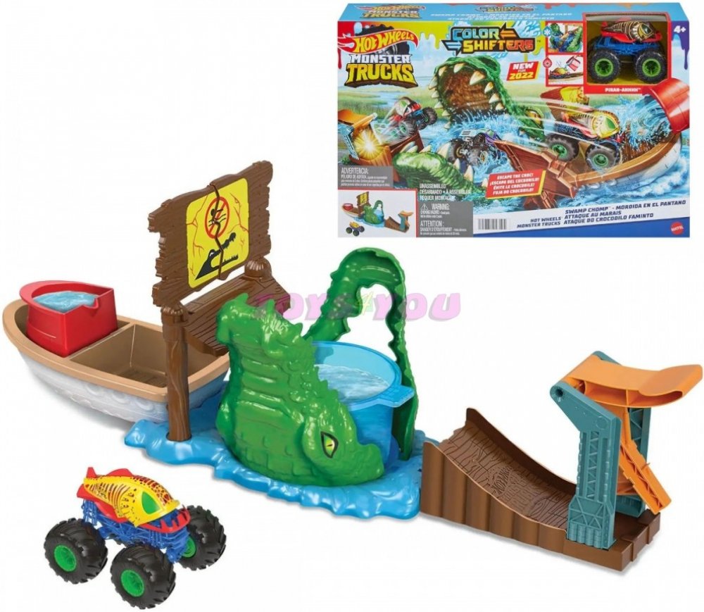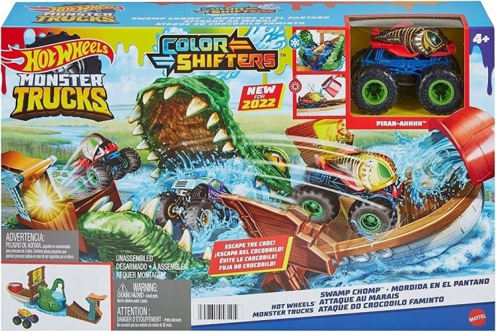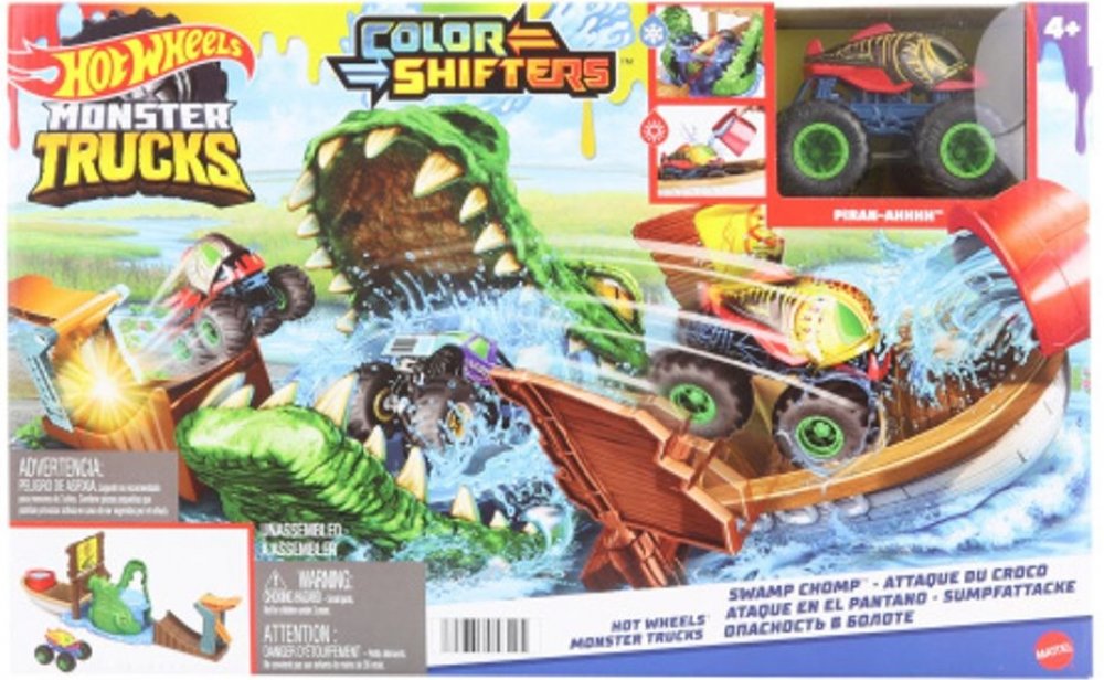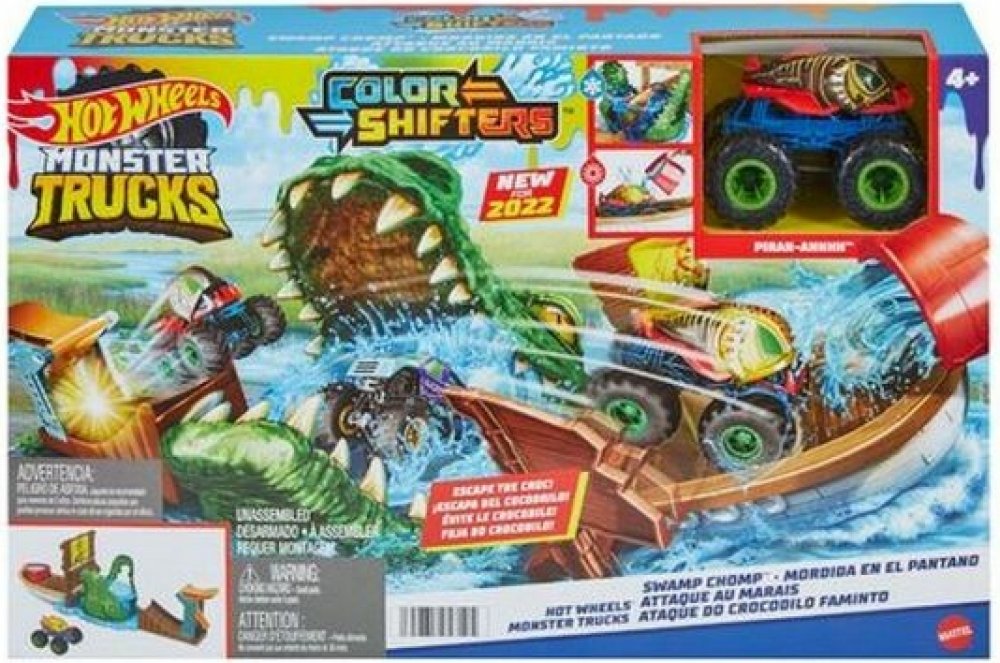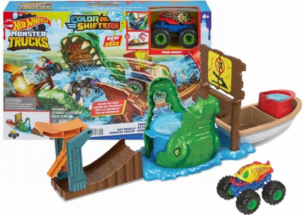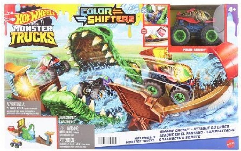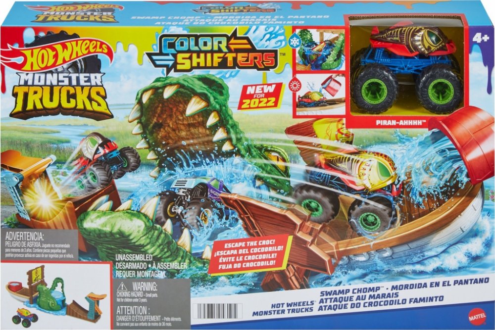 Užijí si s ním spoustu legrace při bourání cedule monster truckem, který najdou v balení. Jakmile auto spadne do krokodýlí tlamy plné studené vody, změní barvu. Pokud se tentokrát autíčko dostane na loď, mohou ho polít teplou vodou, aby došlo k další barevné proměně. Čím častěji kousek opakují, tím častěji má auto jiný design.