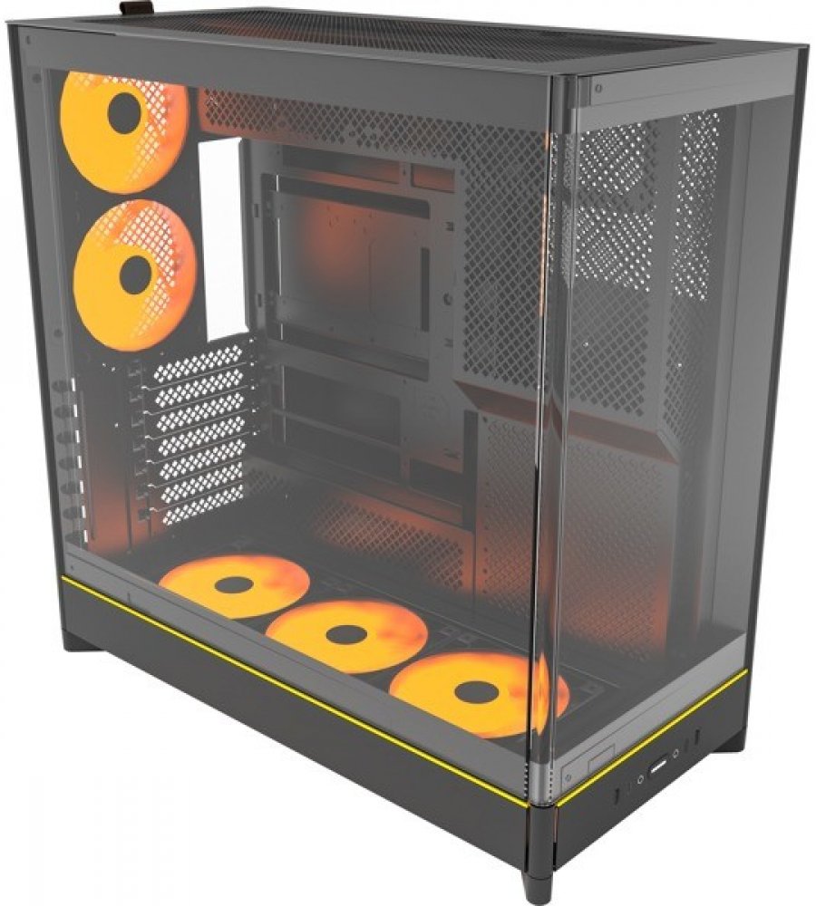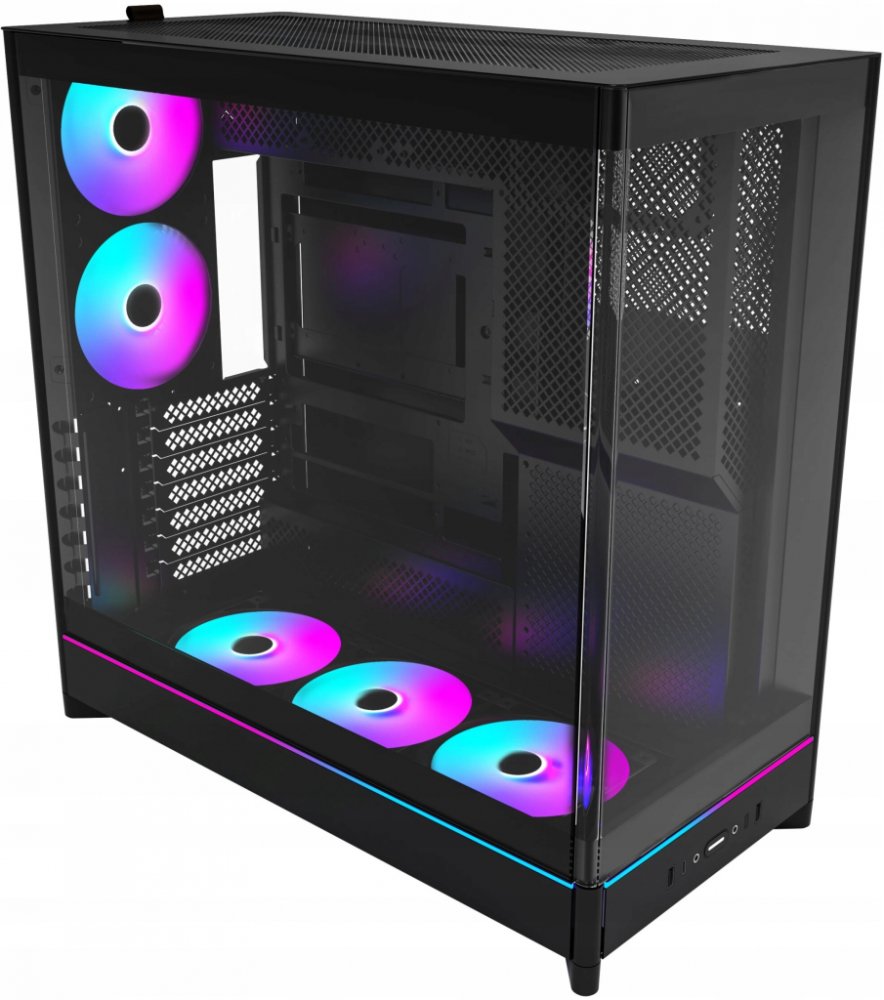 Přední panel ze skla zakřiveného pod úhlem 8° nabízí minimální vizuální rušení a poskytuje široký panoramatický výhled, který exponuje vaši sestavu se zvýšenou průhledností a stylem.