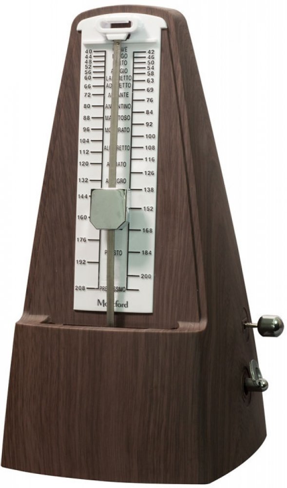 Klasický mechanický metronom ve tvaru pyramidy se zvonkem, čirý plastový odnímatelný přední kryt, plastová povrchová úprava v imitaci dřeva. Hmotnost 0,5 kg, rozměry 205 x 100 x 116 mm.