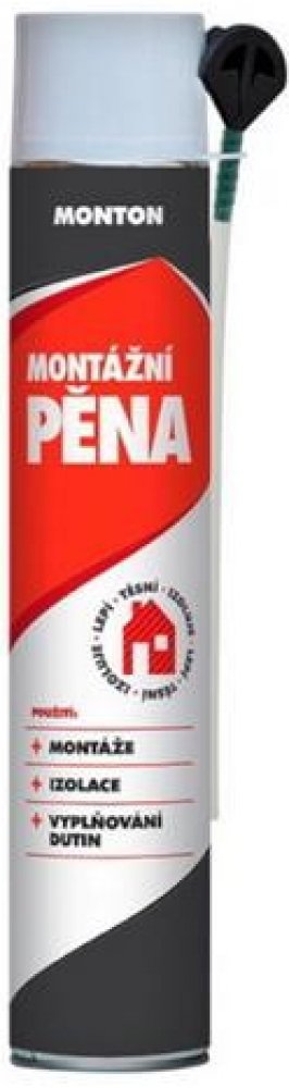 Monton PU pěna 750 ml Detailní popis Monton - montážní pěna 750 ml vynikající přilnavost na většinu materiálů (kromě Teflonu, PE, PP) vynikající tepelně a akusticky-izolační vlastnosti velmi dobré vyplňovací vlastnosti vynikající montážní vlastnosti vynikající stabilita (nesmršťuje se, nehrozí pozdější rozpínání) montáž rámů oken a dveří vyplňování dutin tmelení a vyplňování otvorů v konstrukci střech tvorba zvukově izolační vrstvy montáž a tmelení rámů oken a dveří vyplňování potrubních, kabelových a jiných prostupů spojování i
