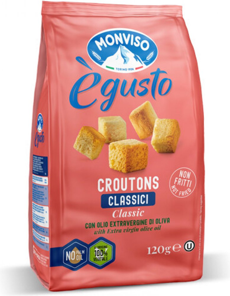 Zábavné kostky lahodného italského chleba, opečeného a ochuceného syrovým extra panenským olivovým olejem. Dodávají nápaditý nádech salátům a polévkám.S tvrdou pšenicí.S extra panenským olivovým olejem.Ne smažené100% rostlinného původu.Bez palmového olejeSložení:Jemná pšeničná mouka, 33% krupice z tvrdé pšenice , 8% olivový olej, 4% extra panenský olivový olej, 2% mořská sůl, pivovarské kvasnice, extrakt z ječného a kukuřičného sladu, cukr, antioxidant: extrakt z rozmarýnu. Může obsahovat stopy sóji , hořčice a lupiny . Skladujte na chladném suchém místě. Vyrobeno v Itálii.Energie 1854 kj/440 kcal,Tuky 13g z toho nasycené 2g,Sacharidy 68 gz toho cukry 3,6 g,Vláknina 3,8 g,Protein 11 g,Sůl 1,7 g.Hmotnost:120g