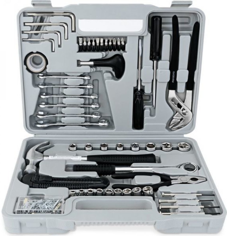 - Kleště na vodní potrubí 240 mm- 6x 100mm šroubovák- PH2 x 100mm šroubovák- bitový ruční ovladač- 6x kroužek / klíč (8, 10, 11, 12, 13, 15 mm)- 11x 25mm šroubovákové bity (slot 4, 5, 6, 7mm, Torx T10, T15, T20, 6kt. PH1, PH2, PH3, 1/4" adaptér)- černá izolační páska Velikost: 19mm x 3m- 4x Šestihranné klíče (3, 4, 5, 6mm)- 8oz Tesařské kladivo- 3/8" ráčna- 9x 1/4" nástavce (5, 6, 7, 8, 9, 10, 11, 12, 13mm)- 8x 3/8" nástavce (10, 11, 12, 13, 14, 15, 17, 19mm)- Nůžna koberce - 150mm kombinované kleště- 4x přesný šroubovák (štěrbinový 2,0, 2,4mm, kříž PH000, PH00)- 85x tříděné spojovací prvky vč. šroubů, hřebíků a hmoždinek v jedné krabici