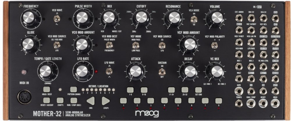 Mother 32 je nová pýcha společnosti Moog. Jde o skutečně Vintage analogový syntezátor, který Vám umožní rychle a jednoduše tvořit nové, nepoznané zvuky.Celý modul je postavený na laserem obráběné hliníkové základní desce, která je po stranách chráněna dřevěnými bočnicemi. Díky tomu získává Mother 32 realistický nádech syntezátorů minulých dekád.Ovládání tohoto nástroje je velmi intuitivní, protože každá funkce má dedikovaný switch nebo potenciometr a vše je velmi přehledně uspořádáno. Pro syntézu samotnou je k dispozici 32 modulárních patch bodů, přičemž 5 patch kabelů je rovnou součástí balení.Mother 32 je osazený desetioktávovým analogovým oscilátorem a analogovým generátorem ruchu. Signály se následně míchají ve směšovači, což umožňuje dynamickou tvorbu a manipulaci zvuku. Následně se zvuk přenáší do Ladder Filteru. Jsou zde k dispozici dva sekvenční styly, což umožňuje každému využít vlastní kreativitu. Vaše zvuky a nápady si následně můžete uložit do paměti, kam se jich vejde až 64.Celý syntezátor je navíc možné rozšířit až o dvě další jednotky a sestavit si tak kompletní syntezátorový rack, který Vám již skutečně umožní tvorbu jakkoli komplexních zvuků a motivů. Možná je i konverze do modulárního euroracku(60HP).ParametryPolyfonie: 1Vstupy: N/AVýstupy: Headphone Jack 6,3 mm TRS, Line Jack 6,3 mm TSProvoz na baterie: NeSekvencer: AnoPaměťové médium: N/AUSB to Host: NeUSB to Device: NeUSB Midi: NeSoftware: N/ABarva: ČernáObsah balení: Manuál, 5 patch kabelůŠířka: 319 mmHloubka: 133 mmVýška: 107 mmHmotnost: 1,6 kgPočet zvuků: 64