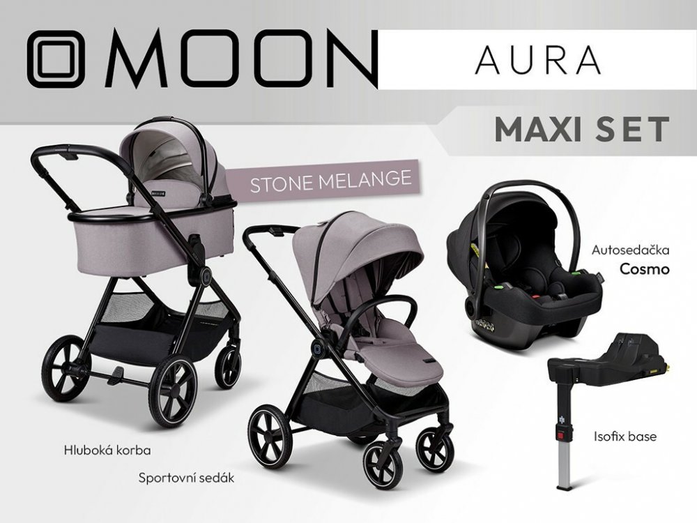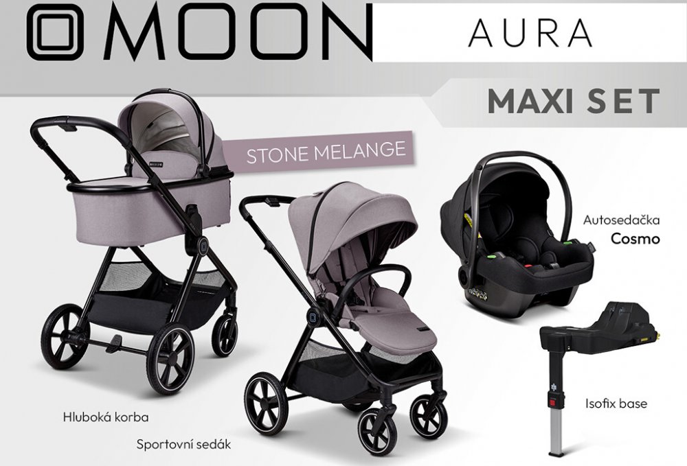 AURA - Maxi: Výhodná sada s kočárkem AURA, autosedačkou COSMO Black Avionaut a Isofixem. Stylový, praktický a snadno ovladatelný kočárek ideální pro mladé rodiny.