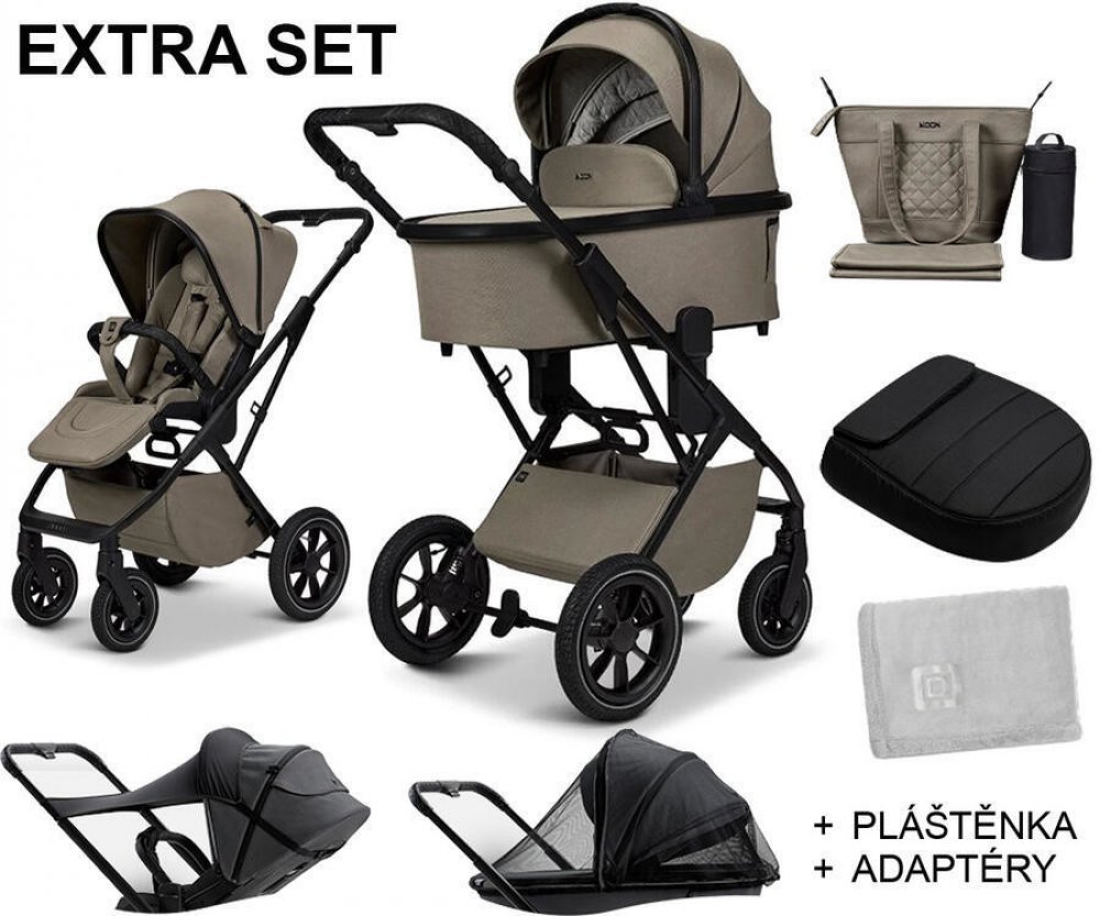 Výhodná sada Moon PIÚ EXTRA obsahuje nánožník black na sportovní verzi, přebalovací tašku v barvě kočárku, moskytiéru, sluneční clonu, pláštěnku a adaptéry na autosedačku.
