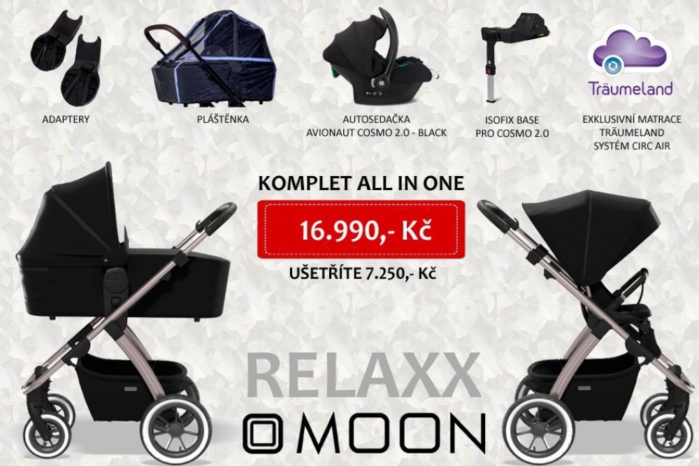 Set Relaxx Black obsahuje kočárek (vhodný od narození do 3 let), autosedačku Avionaut COSMO BLACK, adaptér, pláštěnku a exkluzivní matraci Träumeland s prodyšným systémem CIRC AIR pro zdravou klimatizaci.