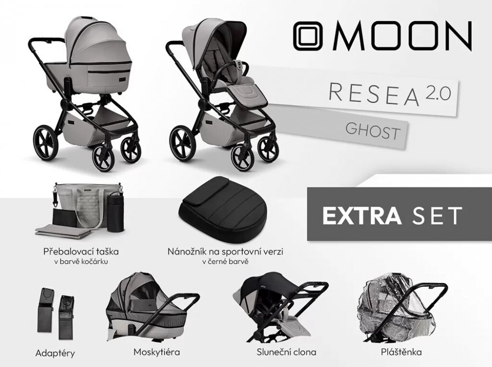 Resea 2.0 Extra Set: Kompletní set s kočárkem a bohatým příslušenstvím: adaptéry, pláštěnka, moskytiéra, sluneční clona, nánožník, stylová přebalovací taška, reflexní pásky. Připraveno na vše!